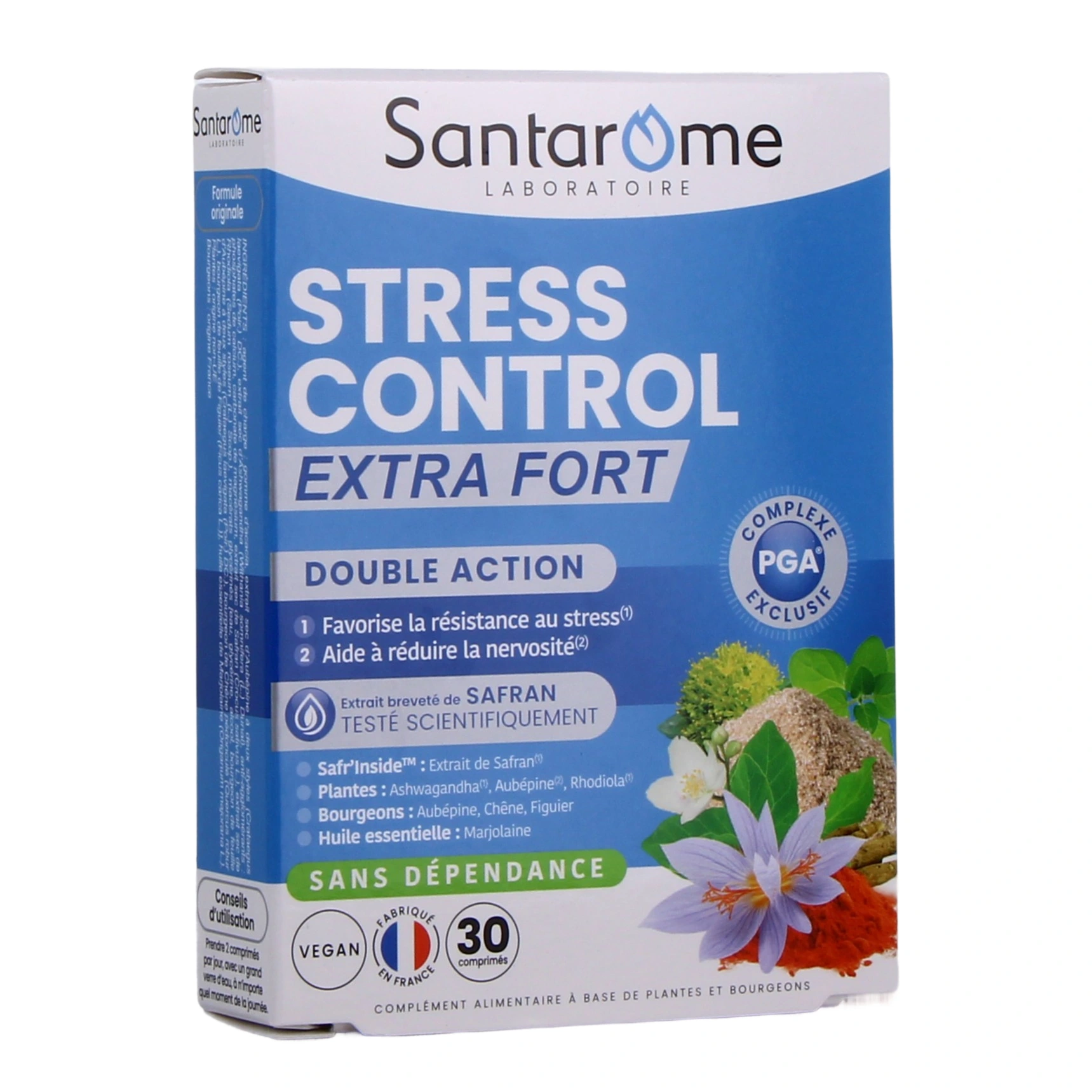 Garanti sans dépendance, Santarome Stress Control Extra Fort est formulé à partir d'un extrait breveté de safran testé scientifiquement (Safr'Inside), de plantes, de bourgeons et d'huile essentielle de marjolaine. Il est fabriqué en France, et sa formule est végan.