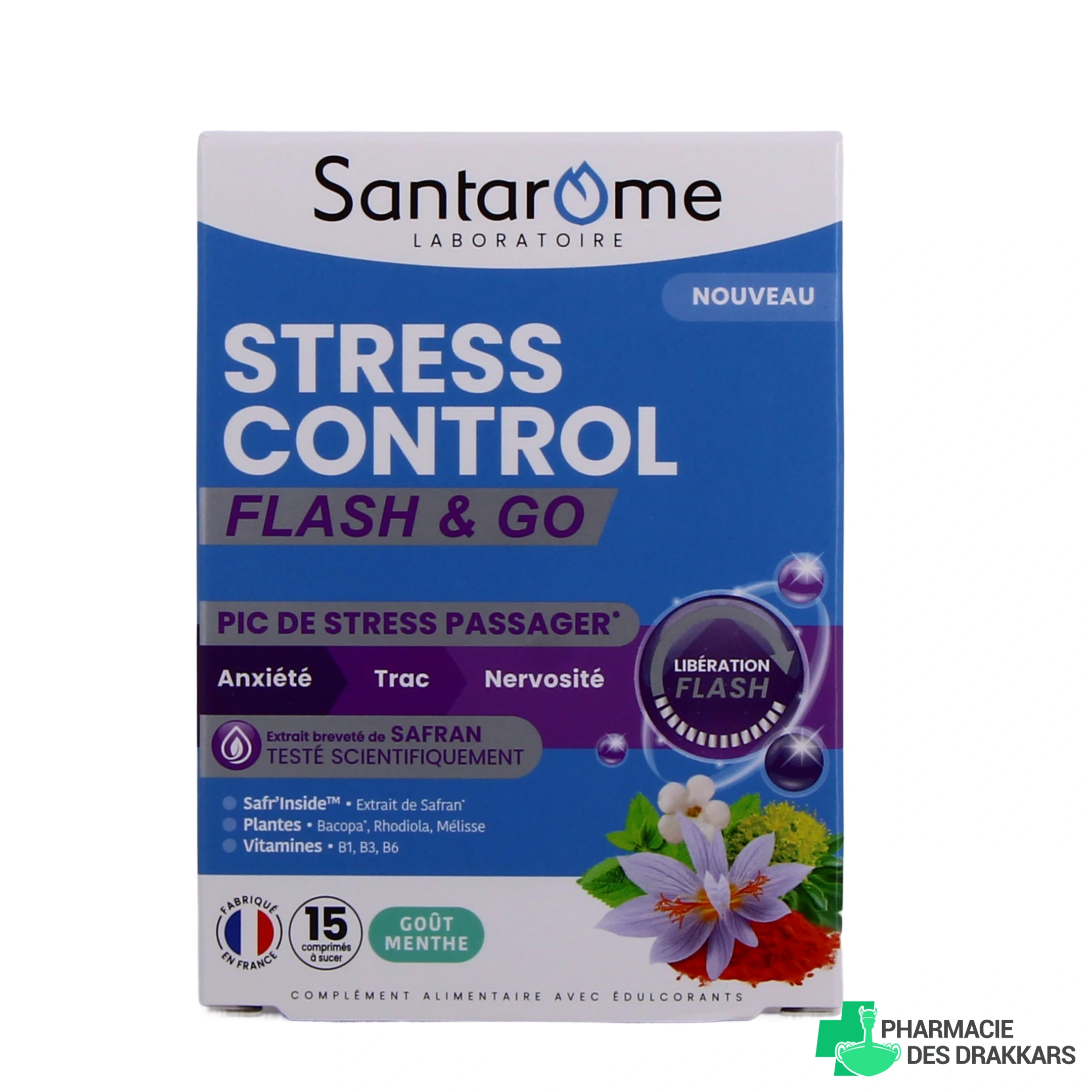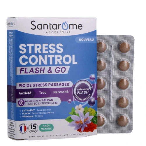 Fabriqué en France et doté d'une formule à libération flash, le complément alimentaire Santarome Stress Control Flash & Go est destiné aux personnes souhaitant retrouver du calme et de la sérénité. Sa formule renferme du Safr'Inside, un extrait de safran encapsulé, breveté et testé scientifiquement sur l'humeur et la gestion du stress. Elle contient également différentes plantes (du bacopa, de la rhodiola et de la mélisse), ainsi que des vitamines B1, B3 et B6.