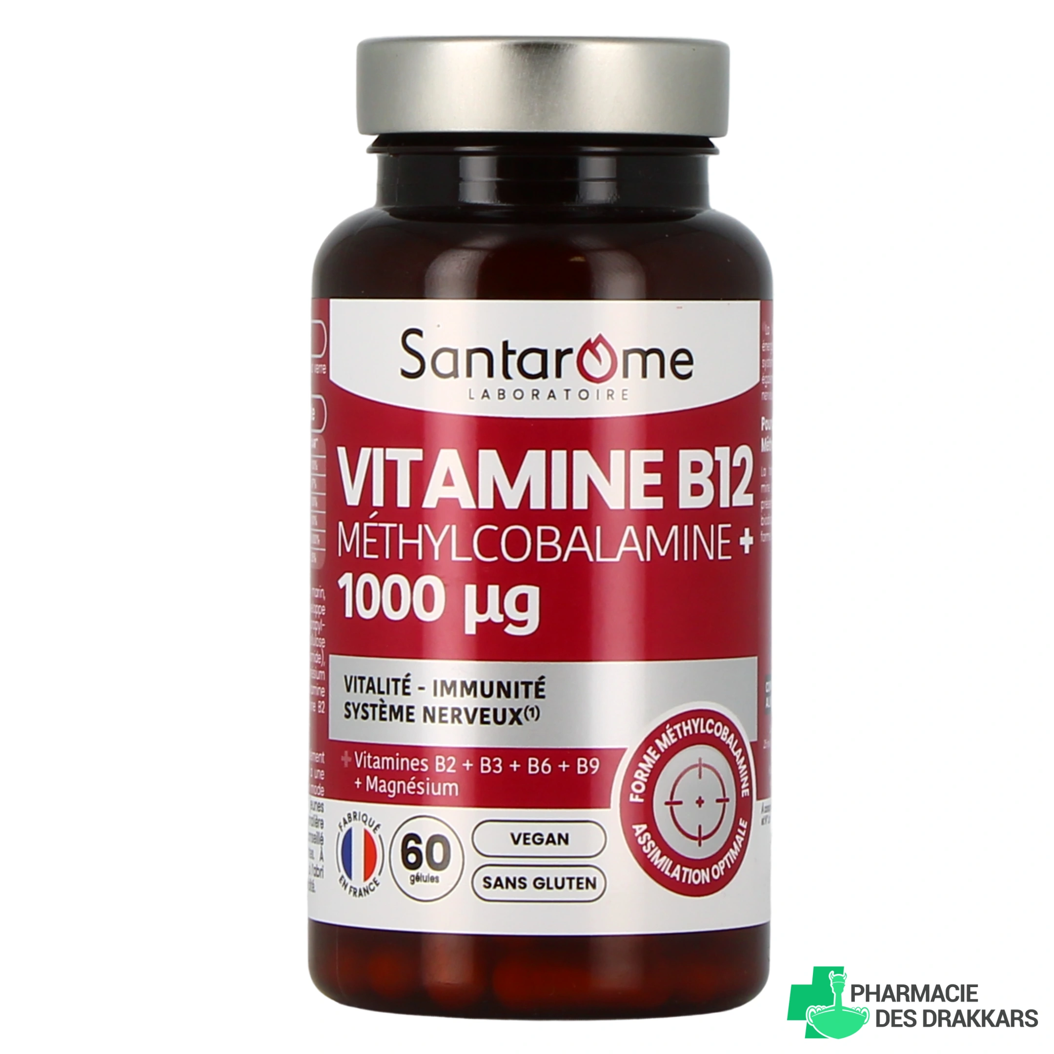 La vitamine B12 méthylcobalamine Santarome est un complément alimentaire qui exerce une triple action sur la vitalité, l'immunité et le système nerveux. Il est indiqué pour les végétariens et vegans, les seniors (car l'absorption diminue avec l'âge) et les personnes fatiguées.