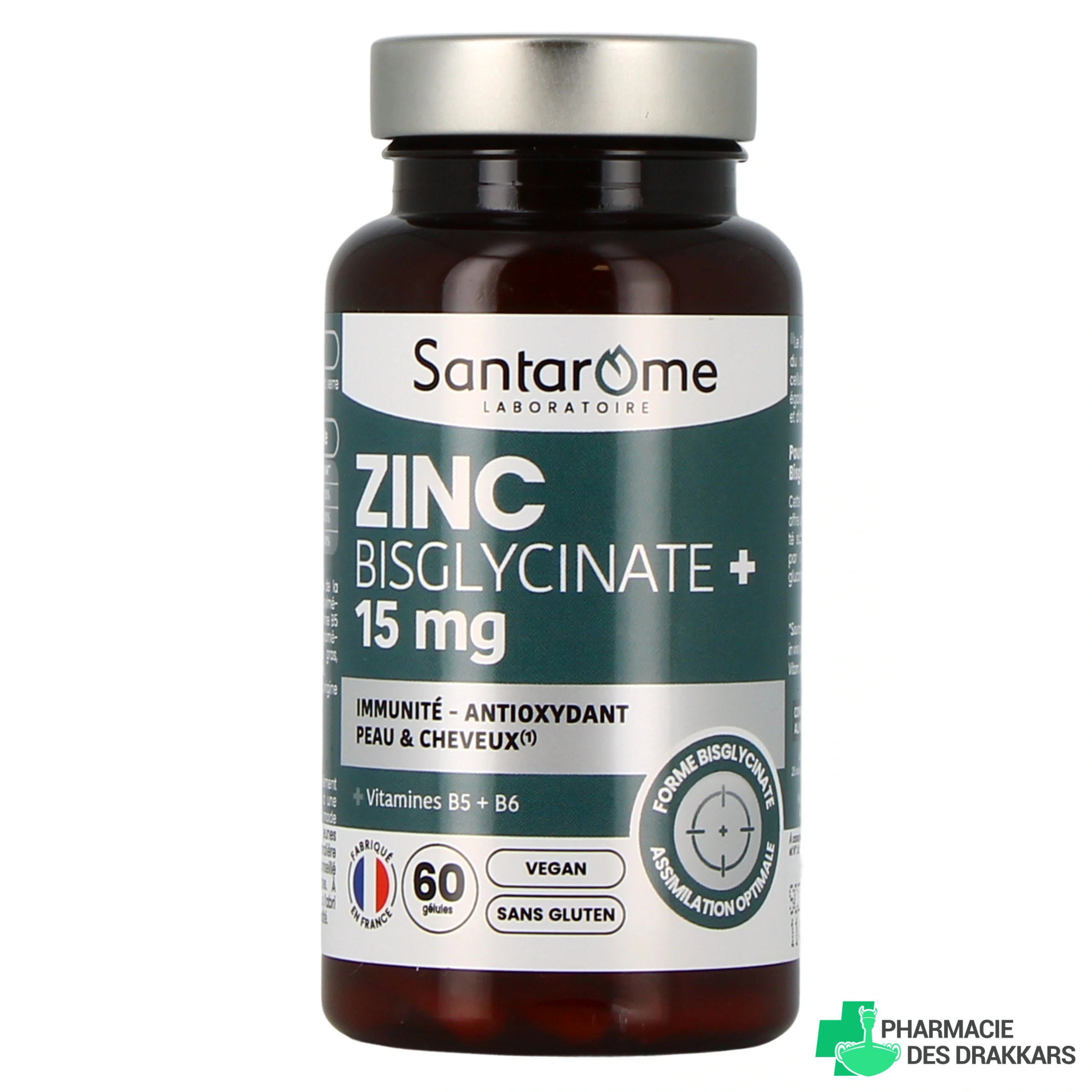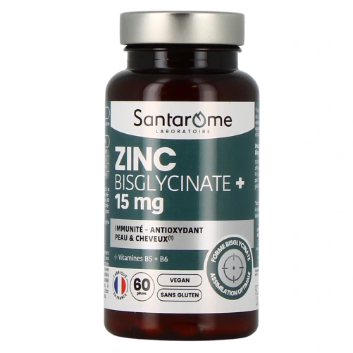Santarome Zinc Bisglycinate est un complément alimentaire à base de zinc bisglycinate pour une assimilation optimale et de vitamines B5 et B6 pour l'immunité, la peau et les cheveux. Il se présente sous la forme de gélules.