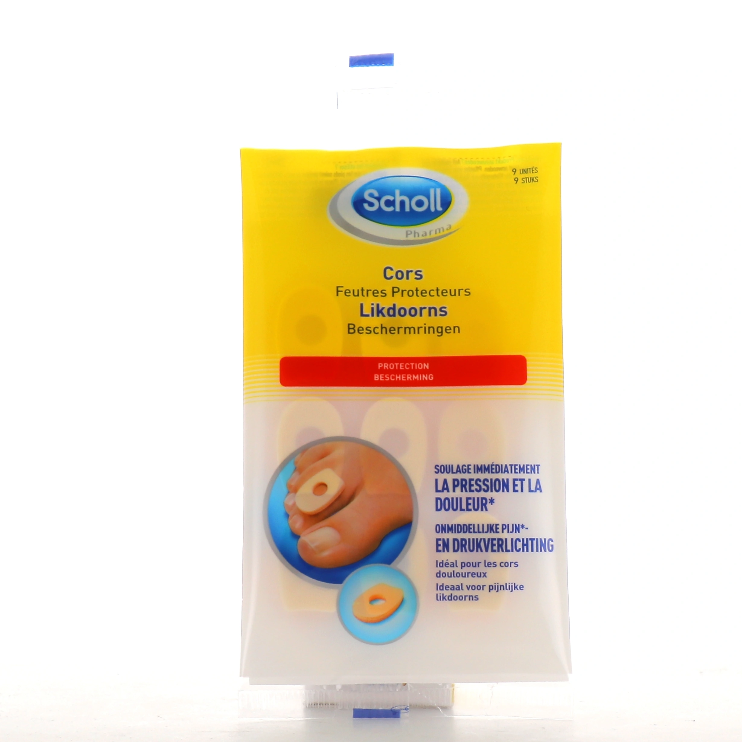 Conditionnement disponible sur notre pharmacie en ligne pour les feutres protecteurs cors Scholl : sachet de 9 feutres mousse.