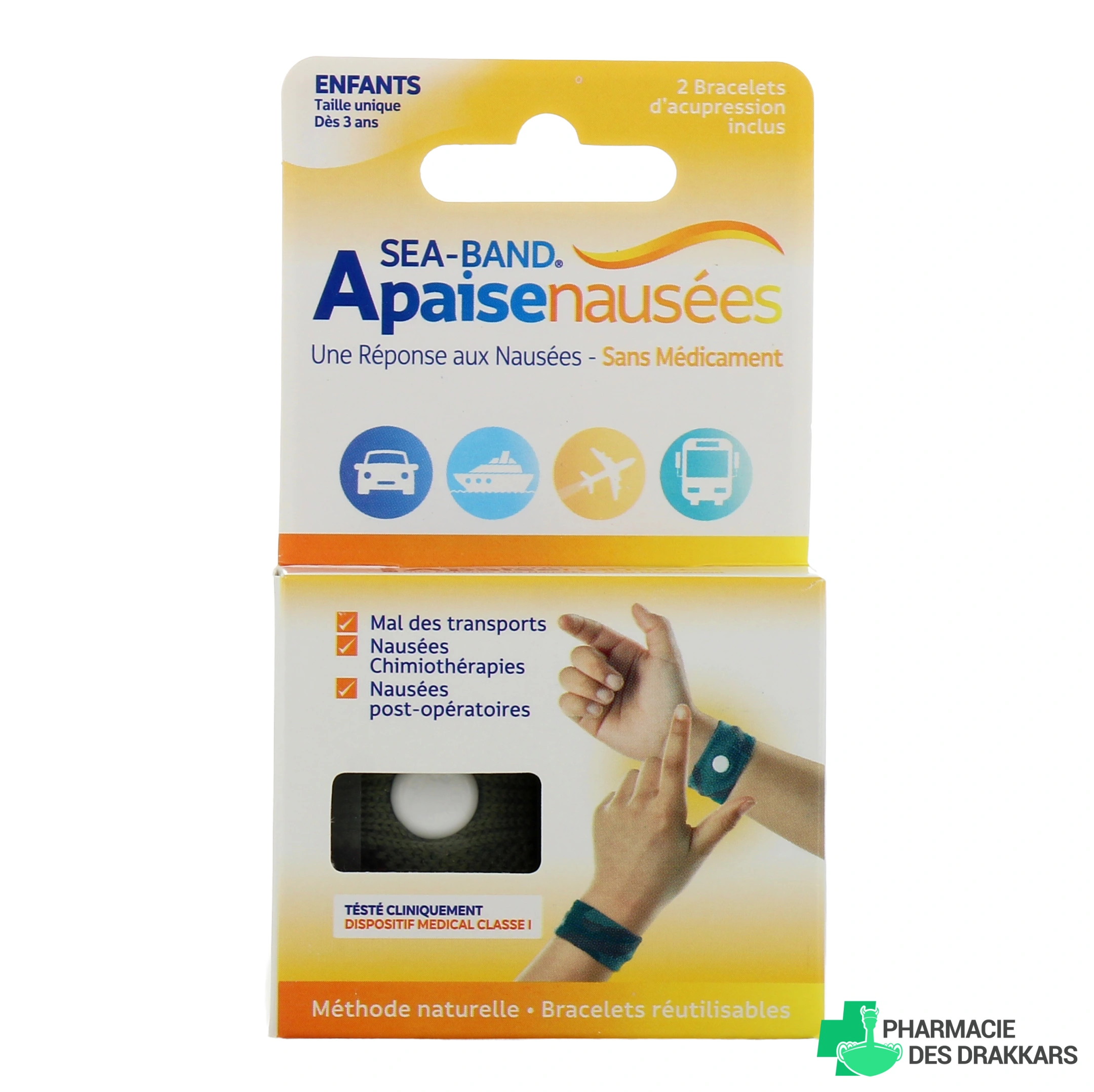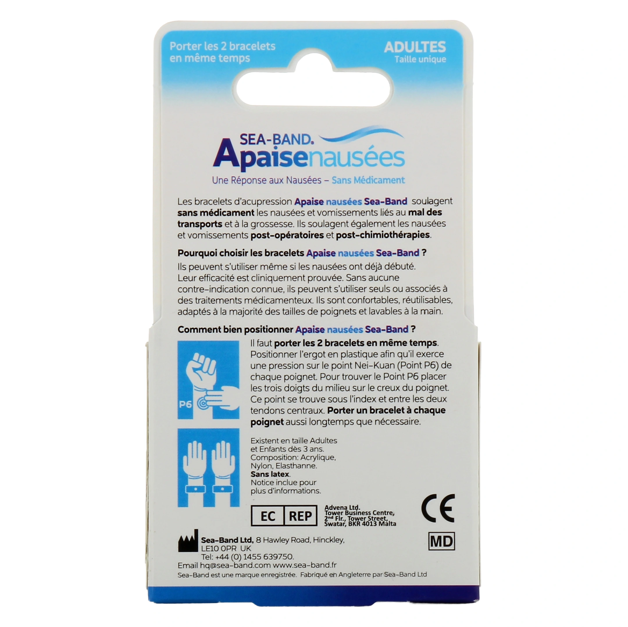 Les bracelets d'acupression Sea Band agissent en exerçant une pression constante sur le point P6 (aussi appelé Nei-Kuan), situé sur le nerf médian au niveau du poignet, afin de soulager les nausées et les vomissements. Bon à savoir : il est essentiel de porter les 2 bracelets en même temps sur chacun de vos poignets pour un maximum d'efficacité. Pratiques, les bracelets peuvent être nettoyés dans votre machine à laver avec le reste de votre linge. Leur efficacité a été prouvée cliniquement. Vous pourriez également être intéressé par le masque de repos Pharmavoyage.