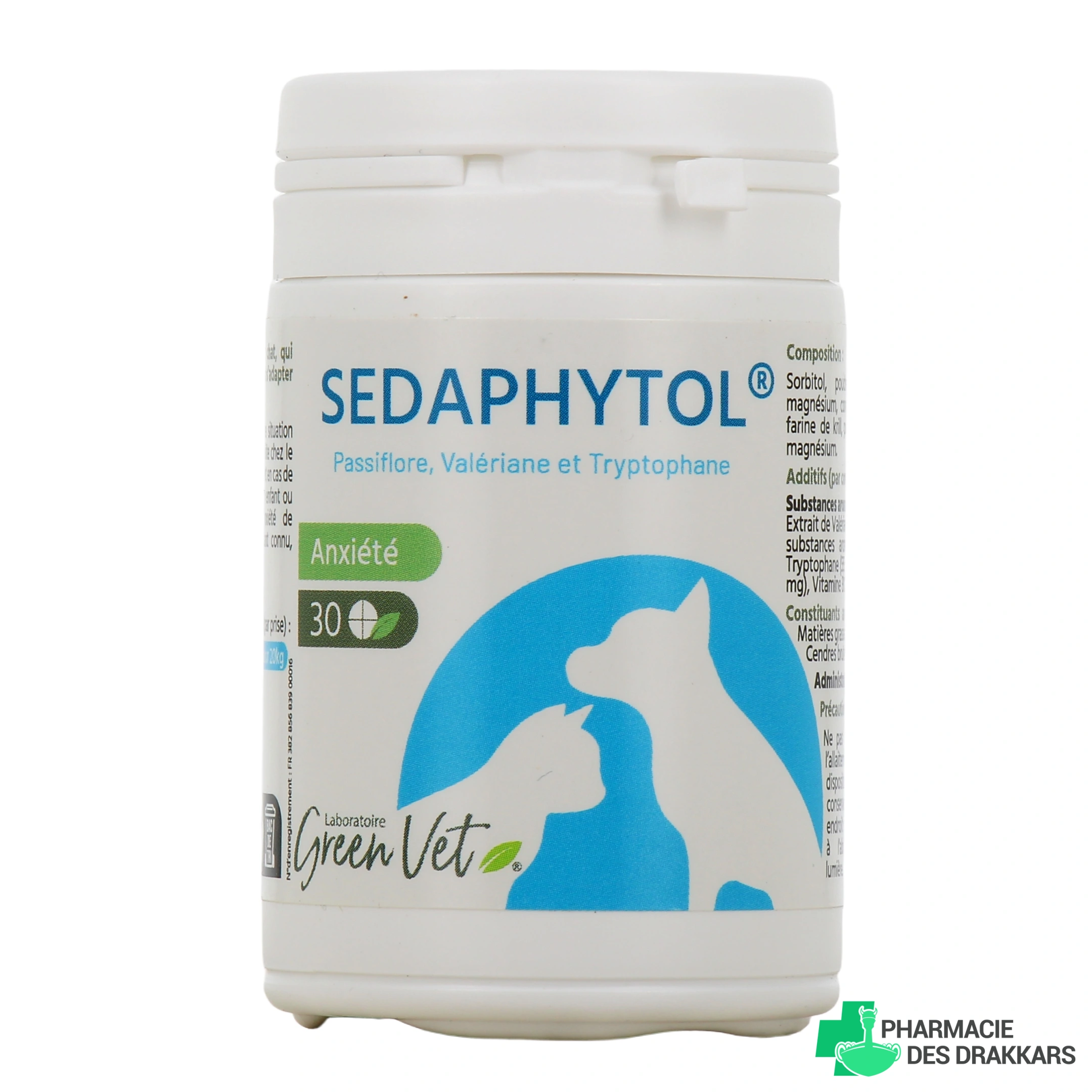 Vous pourrez retrouver le complément alimentaire vétérinaire Sedaphytol de GreenVet dans les présentations suivantes chez Pharmacie des Drakkars : flacon de 30 comprimés appétents arôme bœuf-crevette.