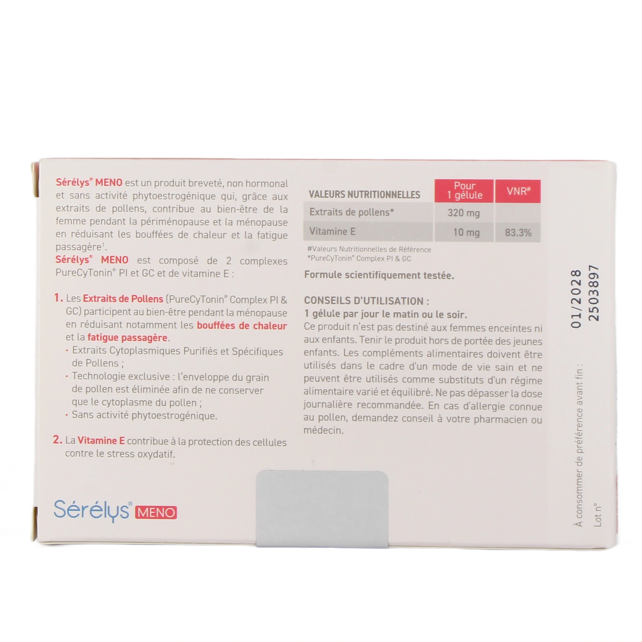 Serelys Meno est formulé avec le complexe PureCyTonin® (Extraits Cytoplasmiques Purifiés et Spécifiques de Pollens) associé à de la vitamine E.