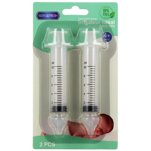 Le kit proposé sur notre pharmacie en ligne contient 2 seringues graduées pouvant contenir jusqu'à 10 ml de sérum physiologique ou solution saline. 2 embouts en silicone sont fournis, garantissant un lavage de nez en toute sécurité et douceur pour l'enfant. Lavable et réutilisable, la seringue est une solution écologique et économique, surtout lorsque l'on doit moucher bébé de manière régulière.