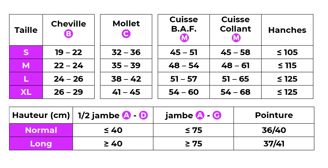 | Taille | Cheville (cm) | Mollet (cm) |