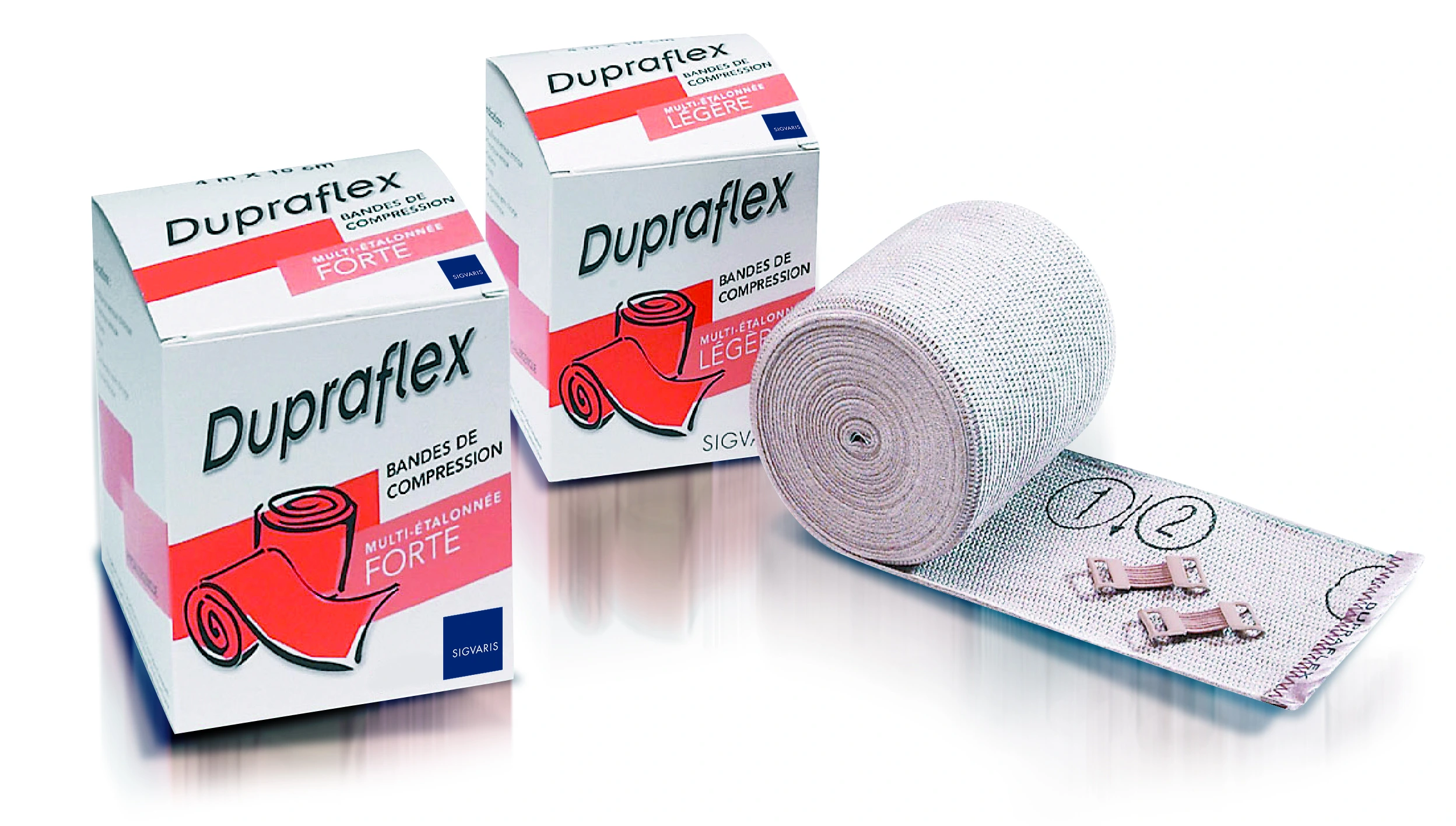 Conditionnements disponibles sur votre pharmacie en ligne pour la bande de compression multi-étalonnée forte Dupraflex Sigvaris : 1 bande de compression Sigvaris - Largeur et longueur au choix.