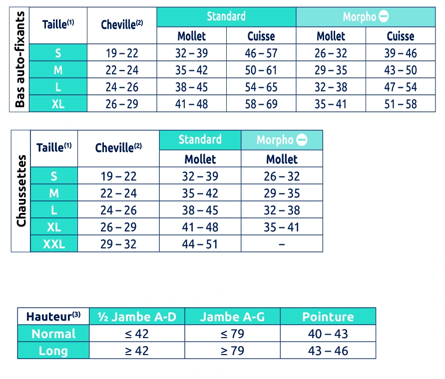 Pour un résultat optimal, il est conseillé de porter les bas de contention le plus tôt possible après le réveil sur une peau propre et sèche. Après avoir enfilé les bas, il est important de lisser le tissu avec le plat des mains afin d'éviter qu'il n'y ait de plis. Pour l'entretien des bas de contention, nous préconisons un lavage quotidien sur le programme délicat (30°C). Idéalement, il faudrait les placer dans un filet de lavage pour éviter qu'ils ne s'abîment tout en veillant à ne pas utiliser d'assouplissant, de détergent et d'eau de javel. Pour le séchage, ne pas passer au sèche-linge mais privilégier un lavage à l'air libre, loin de toute source de chaleur. Pour ne pas vous tromper dans le choix de la taille adaptée à votre morphologie, nous vous conseillons de vous référer au tableau ci-contre.| Taille | Cheville (cm) | Standard | Morpho - | ||