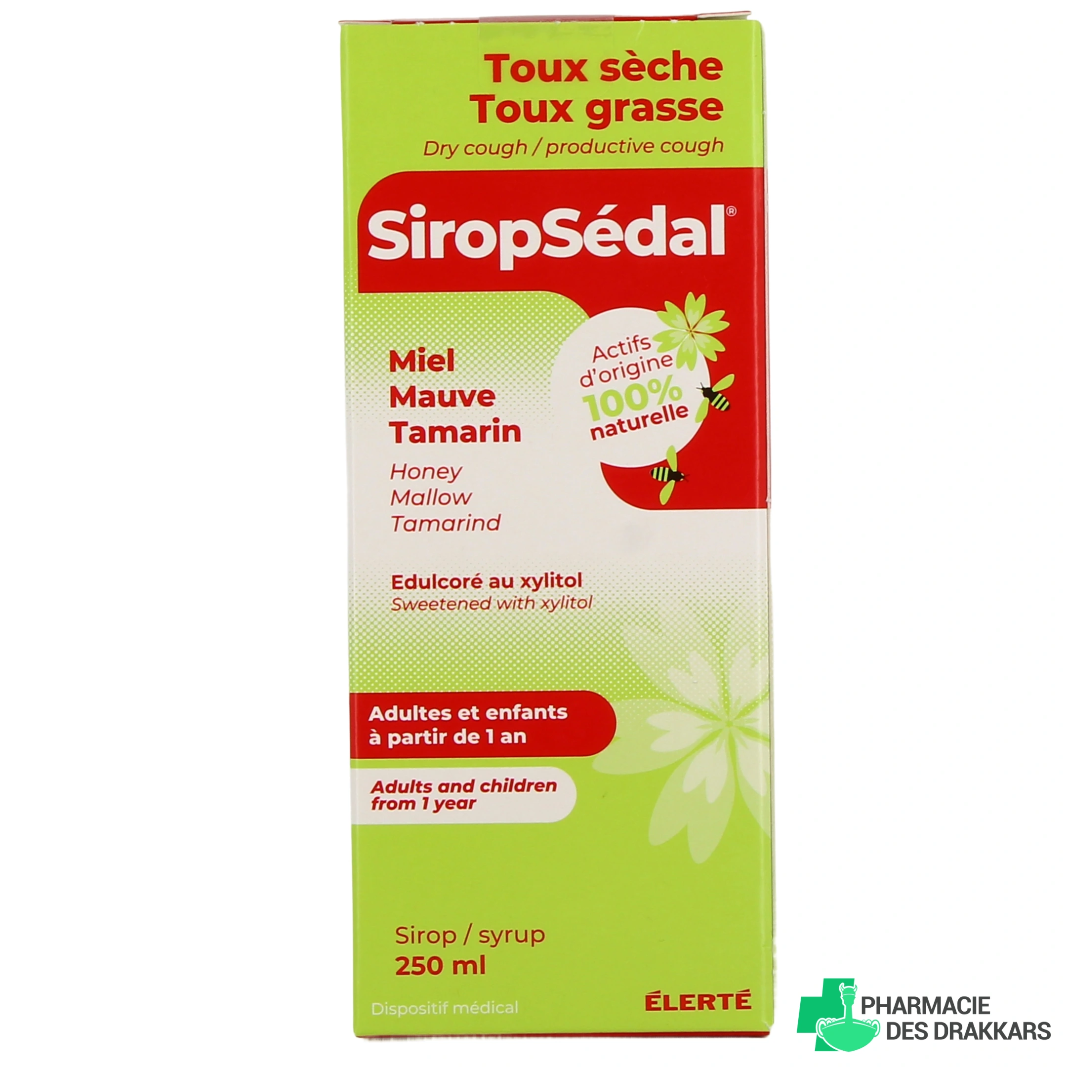 SiropSedal est un sirop pour la toux grasse (productive) et la toux sèche (non productive), à base de miel, de mauve et de tamarin.