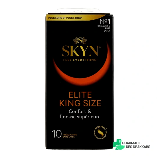 Vous pourrez retrouver les préservatifs Skyn Elite King Size sans latex dans les conditionnements suivants chez Pharmacie des Drakkars : boîte de 10 préservatifs grande taille.