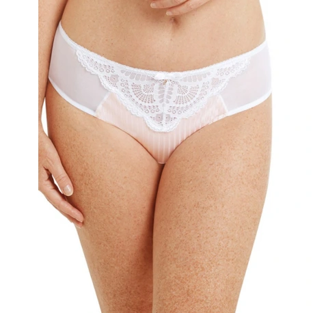 Le slip Karolina par Amoena est pourvu de petits noeuds en satin sur l'avant et sur l'arrière, ainsi que d'un pendentif doré à l'avant, pour une note d'élégance bienvenue. Le slip Karolina s'accordera ainsi parfaitement avec le soutien-gorge. Vous aimerez aussi ses jolis détails en dentelle au niveau de la ceinture, et le tissu rayé séduisant visible à l'arrière et à l'avant.
