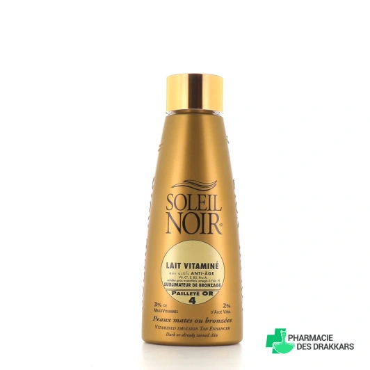 Présentation disponible pour le lait vitaminé pailleté or Soleil Noir sur notre pharmacie en ligne : Flacon de 150 ml