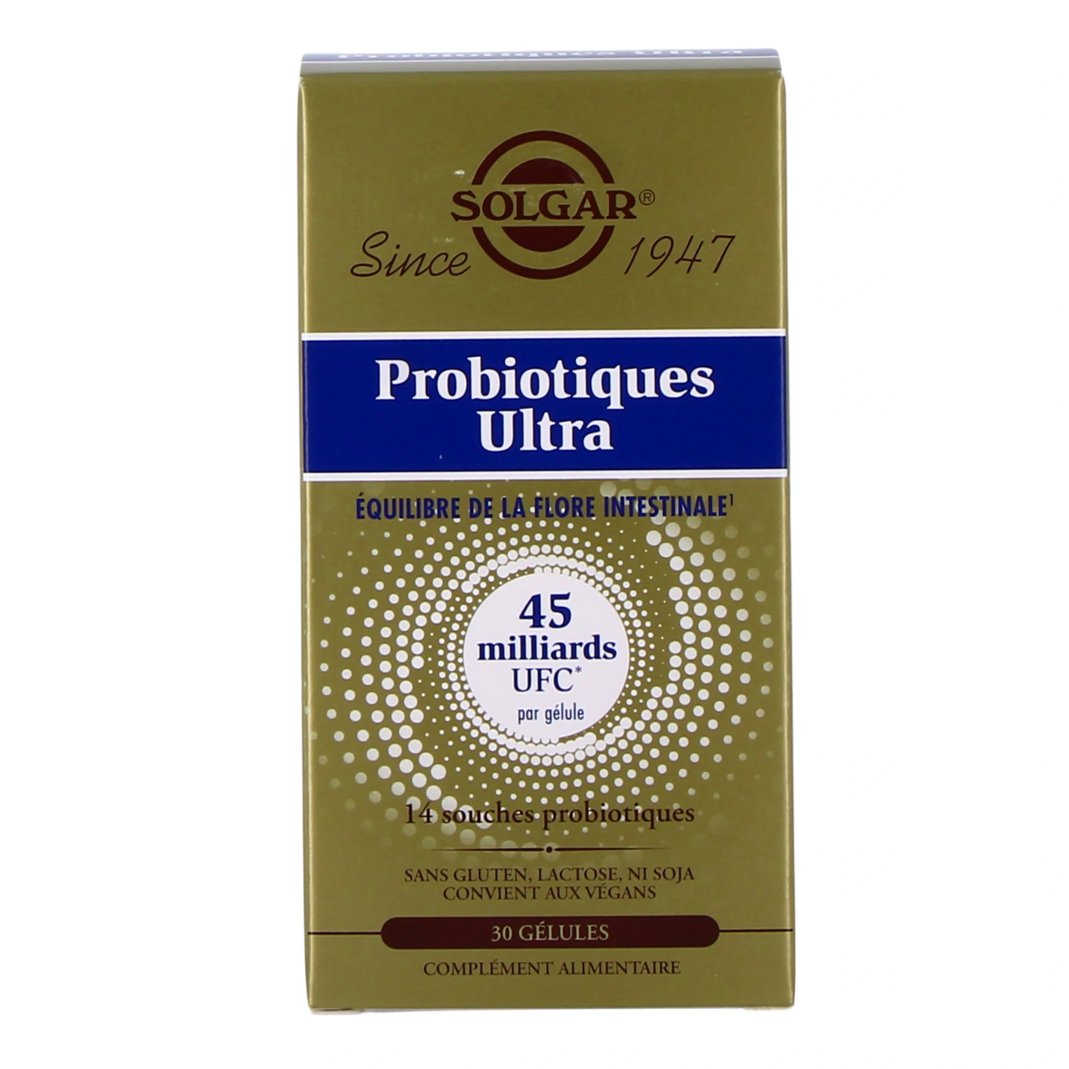 Présentation proposée sur notre pharmacie en ligne pour Solgar Probiotiques Ultra : boîte de 30 gélules végétales.