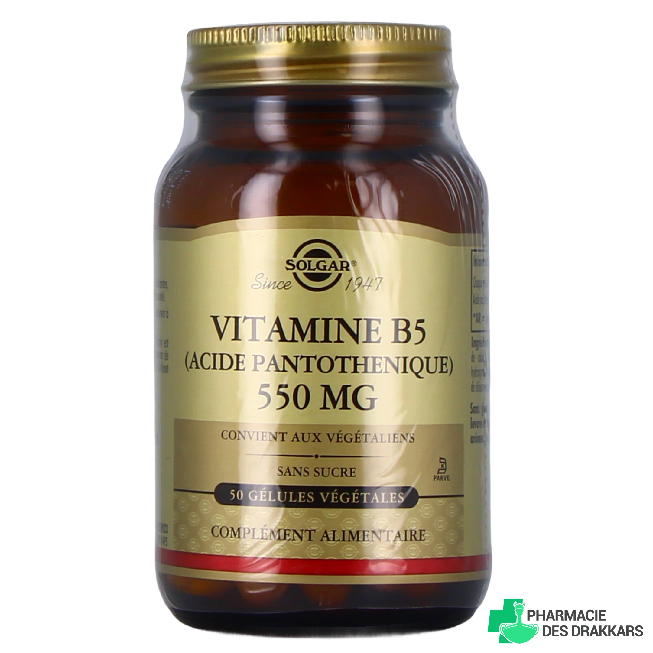 Une gélule de vitamine B5 Solgar contient 550 mg d'acide pantothénique.
