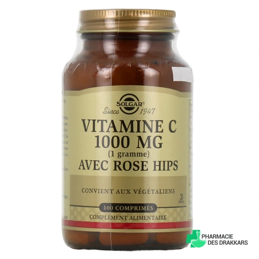 Solgar Vitamine C 1000 mg avec Rose Hips est un complément alimentaire qui convient aux végétariens, sous forme de comprimés sans sucre ni sel. 1 comprimé vous apporte 1000 mg soit 1 g de vitamine C, ce qui correspond à 1250% des Apports de Référence. Les comprimés de Solgar Vitamine C 1000 mg avec Rose Hips sont sans gluten, blé, dérivés laitiers, soja, levures et sans conservateurs, édulcorants, arômes et colorants artificiels.