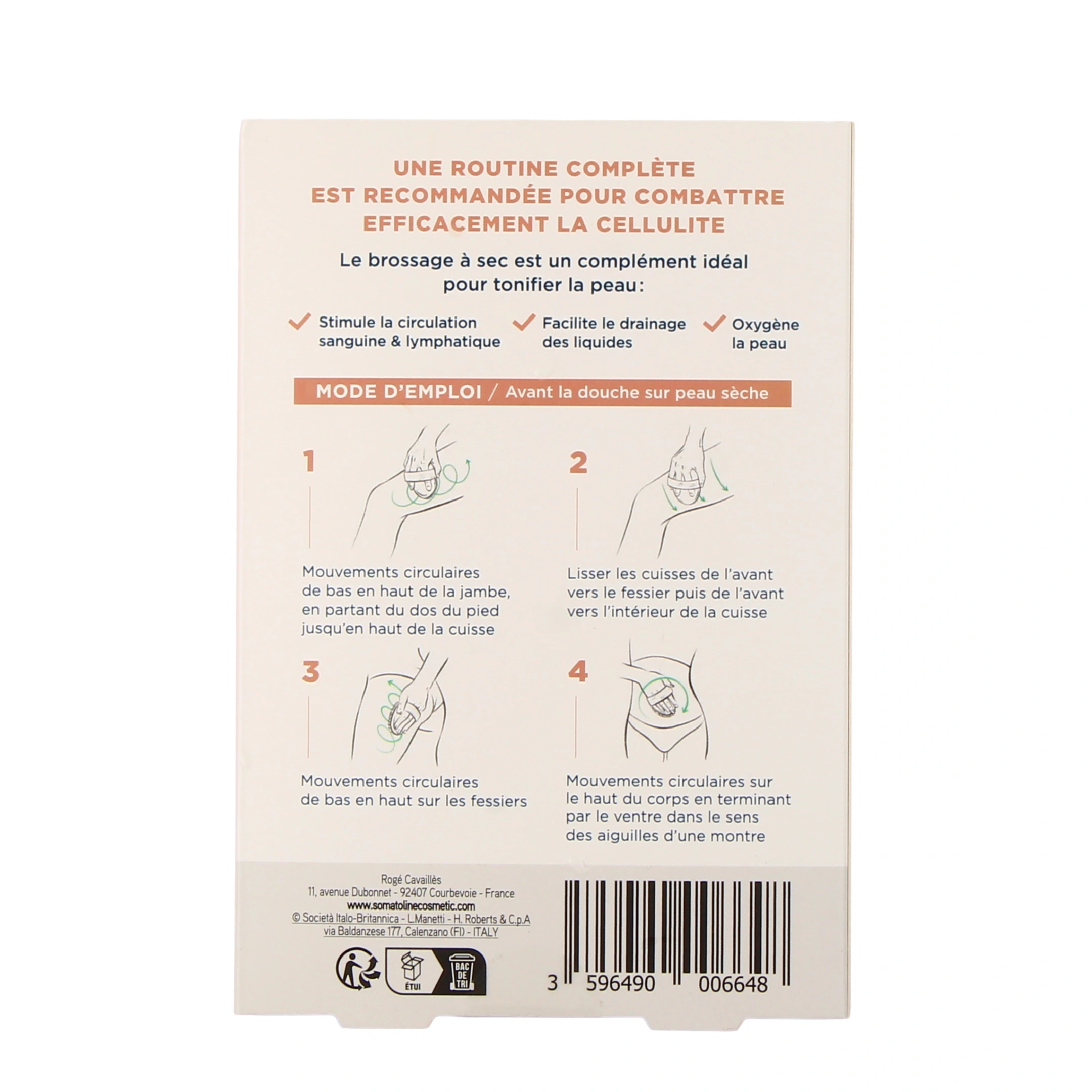 Conditionnement proposé par notre pharmacie en ligne pour le gel effet froid anti-cellulite Somatoline Cosmetic : tube de 250 ml ou lot avec la brosse de massage à sec.