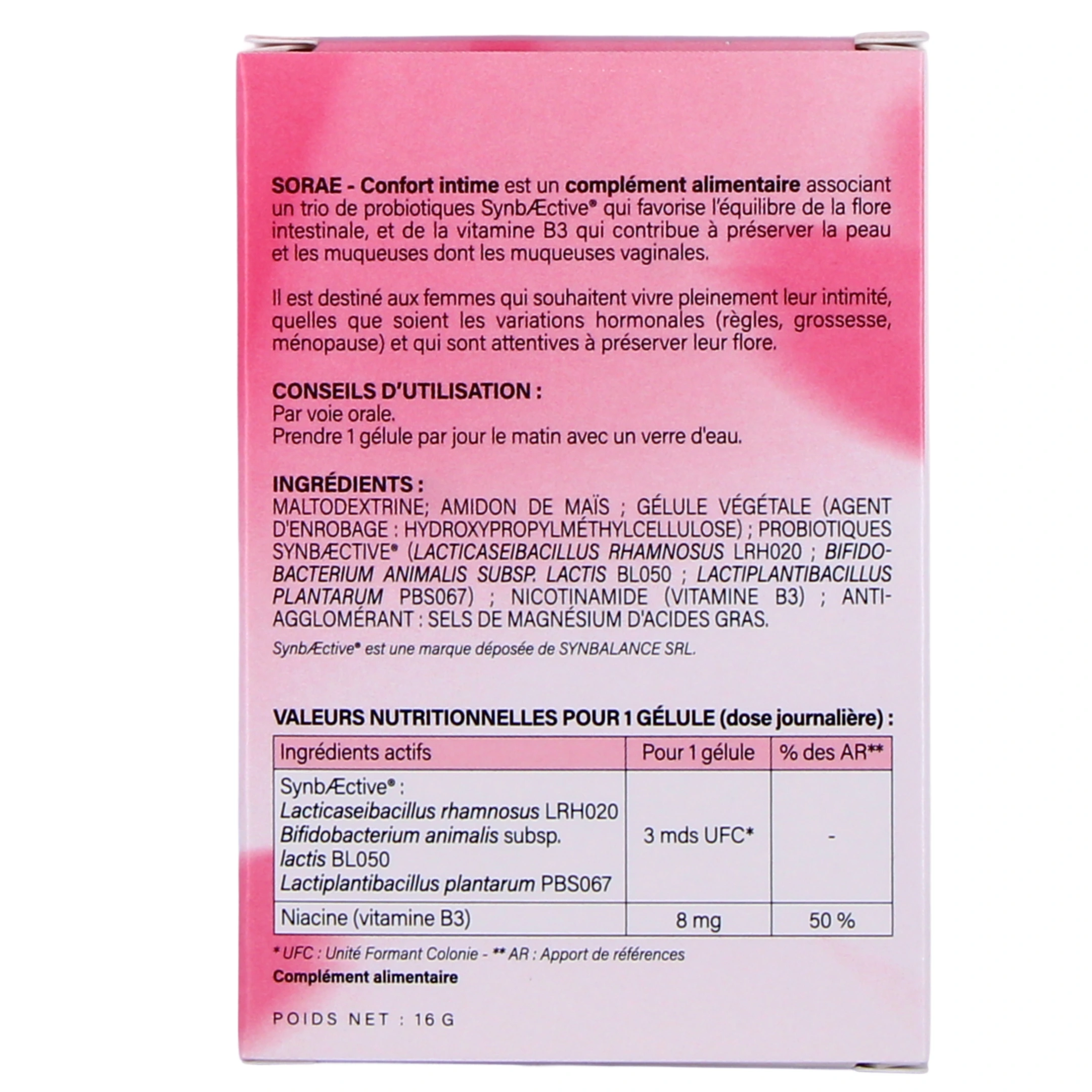 Sorae - Confort intime est un complément alimentaire associant un trio de probiotiques SynbÆctive qui favorise l'équilibre de la flore intestinale, et de la vitamine B3 (aussi appelée niacine) qui contribue à préserver la peau et les muqueuses dont les muqueuses vaginales. La niacine (vitamine B3) est nécessaire à la structure et au fonctionnement de la peau et des muqueuses, dont les muqueuses vaginales. Testé cliniquement (études cliniques réalisées sur le complexe de probiotiques brevet SynbÆctive).