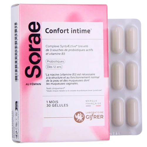 Sorae Confort Intime est un complément alimentaire du laboratoire Gifrer sous forme de gélules, et formulé afin de soutenir le fonctionnement normal de la peau et des muqueuses, notamment les muqueuses vaginales.