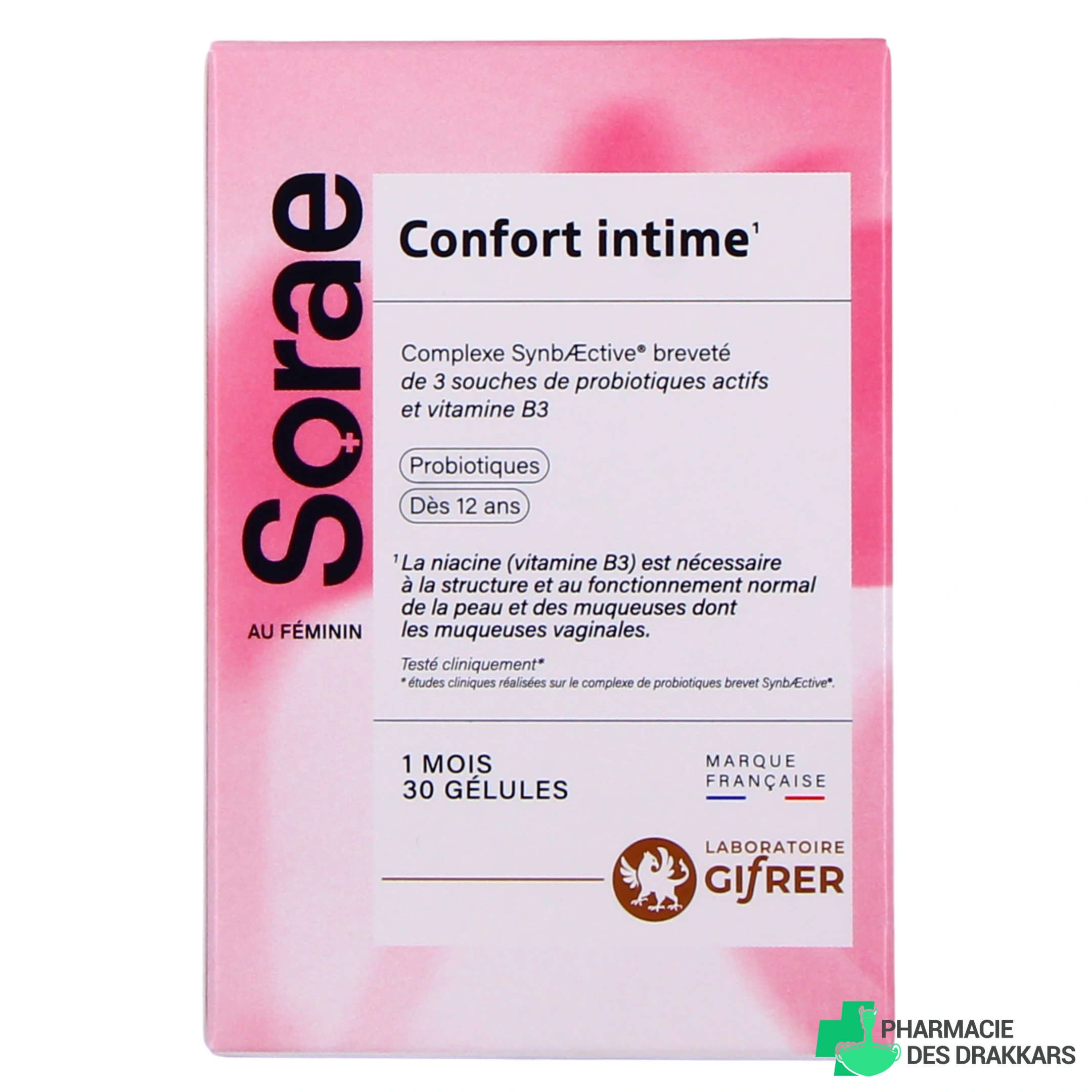 Vous pourrez retrouver le complément alimentaire Sorae Confort Intime de Gifrer dans les présentations suivantes chez Pharmacie des Drakkars : boîte de 30 gélules (pour 1 mois).