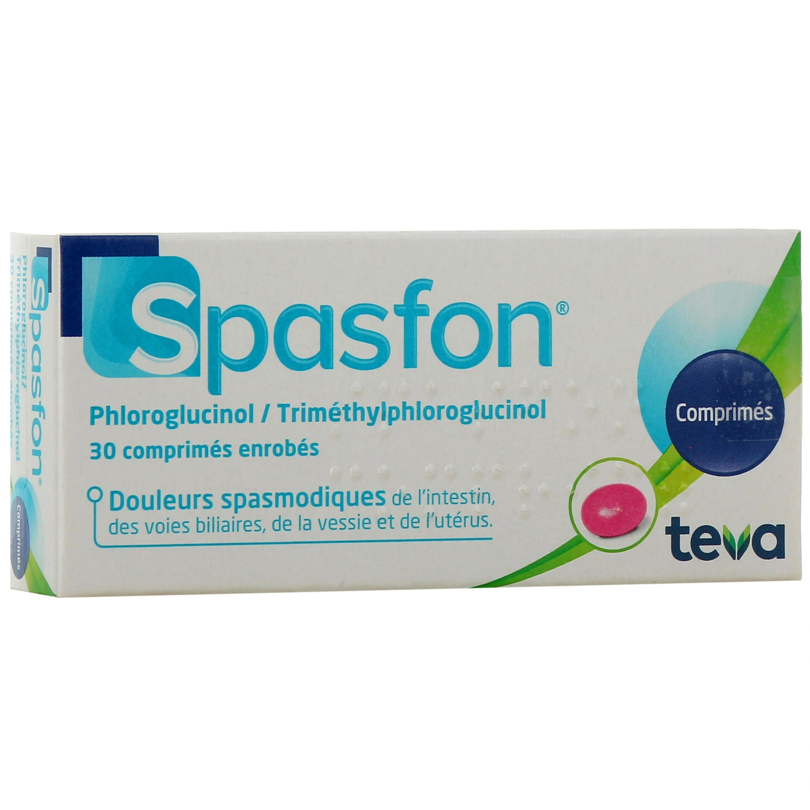 Conditionnements disponibles sur votre pharmacie en ligne pour les comprimés Spasfon : Boîte de 30 comprimés enrobés