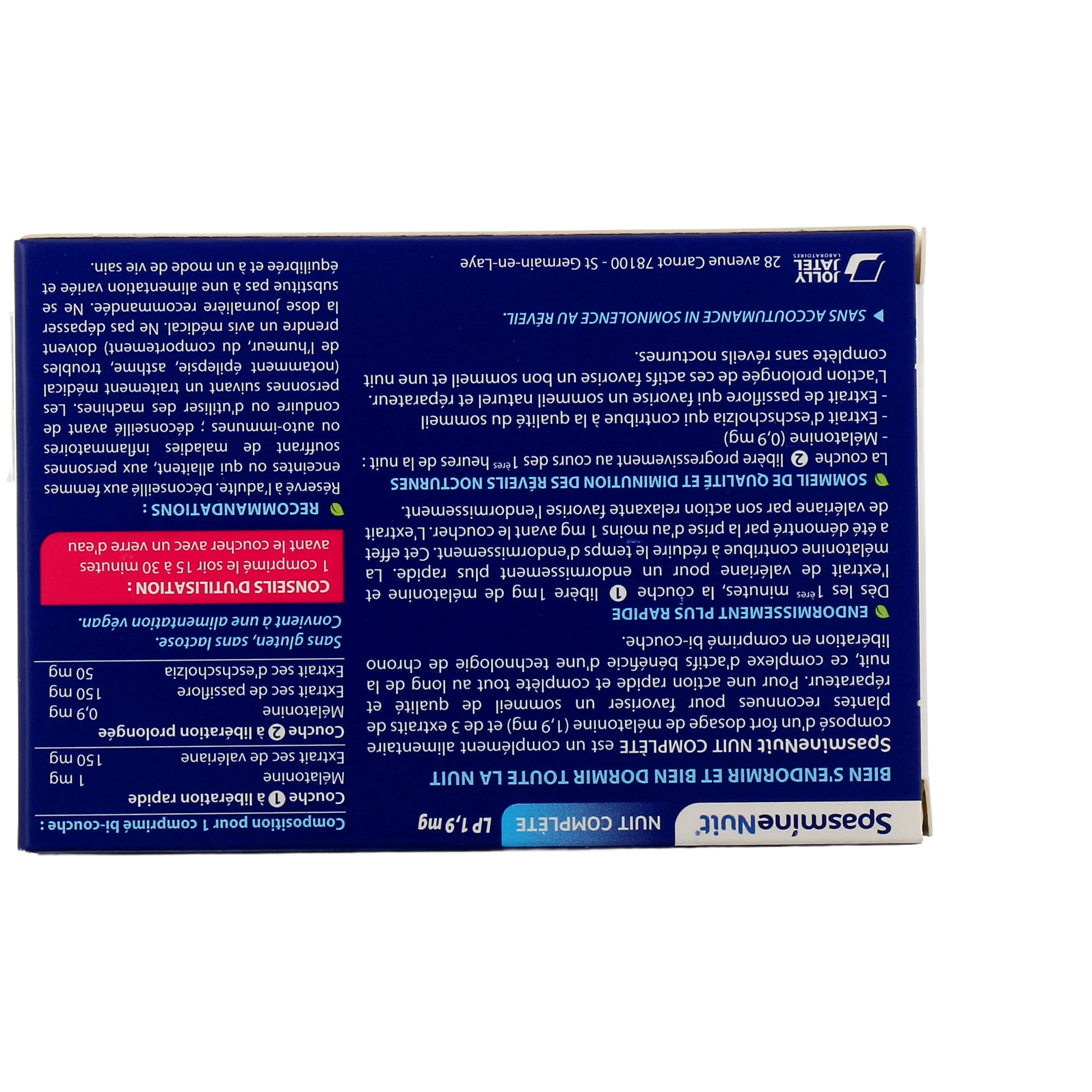 SpasmineNuit Nuit Complète est un complément alimentaire composé d'un fort dosage de mélatonine (1,9 mg) et de 3 extraits de plantes reconnues pour favoriser un sommeil de qualité et réparateur. Pour une action rapide et complète tout au long de la nuit, ce complexe d'actifs bénéficie d'une technologie de chrono-libération en comprimé bi-couche.