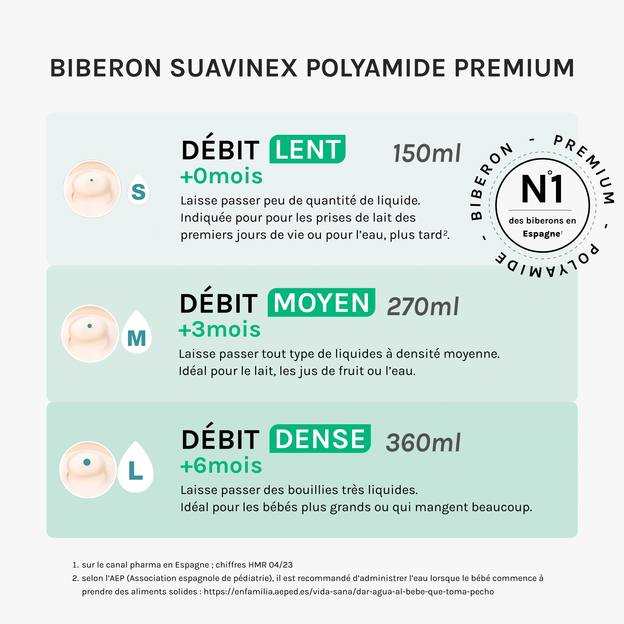 Le choix de votre Biberon Suavinex en polyamide dépend du débit de la tétine :