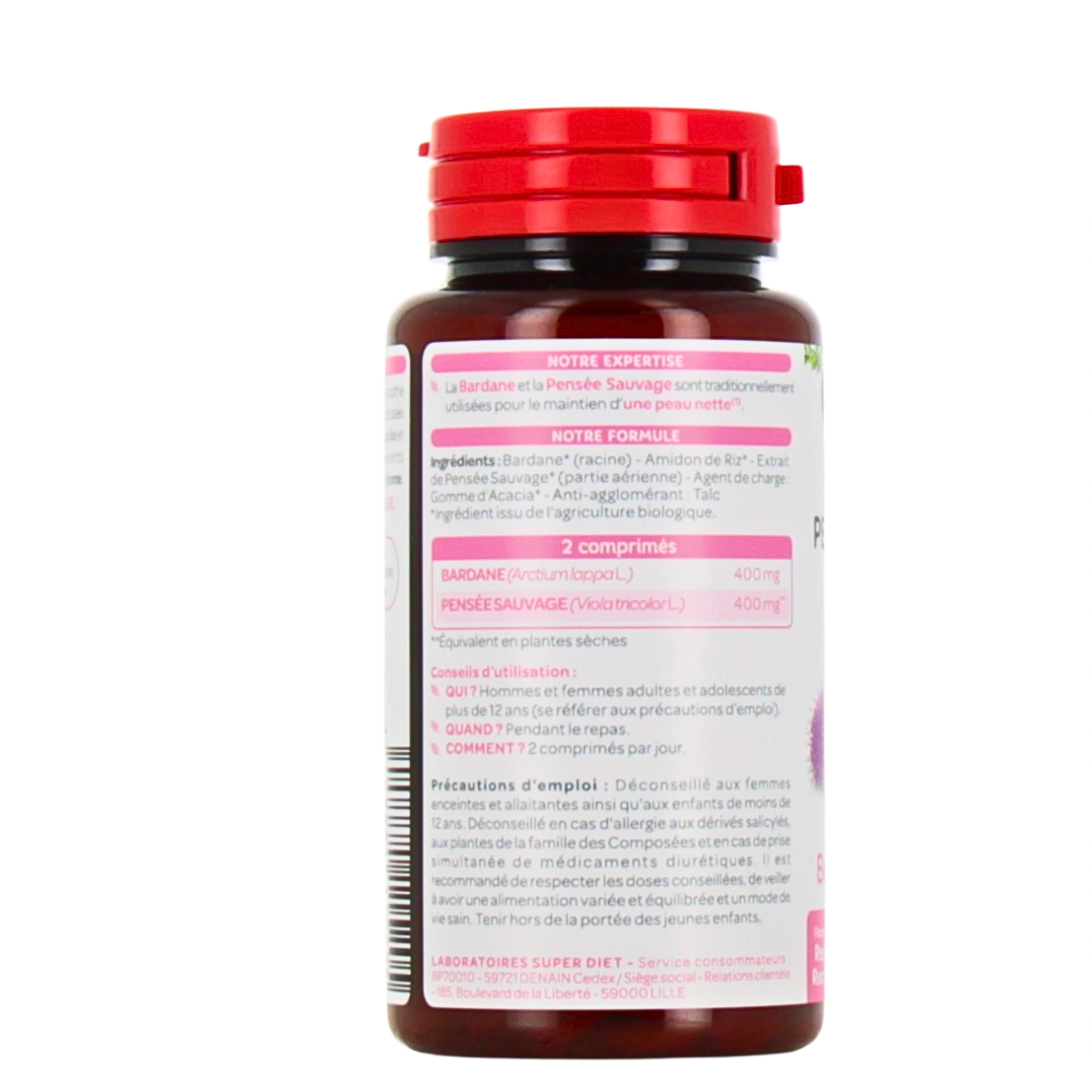 Super Diet Bardane Pensée Sauvage est un complément alimentaire à base de bardane et de pensée sauvage bio pour la beauté de la peau. Il se présente sous la forme de comprimés.