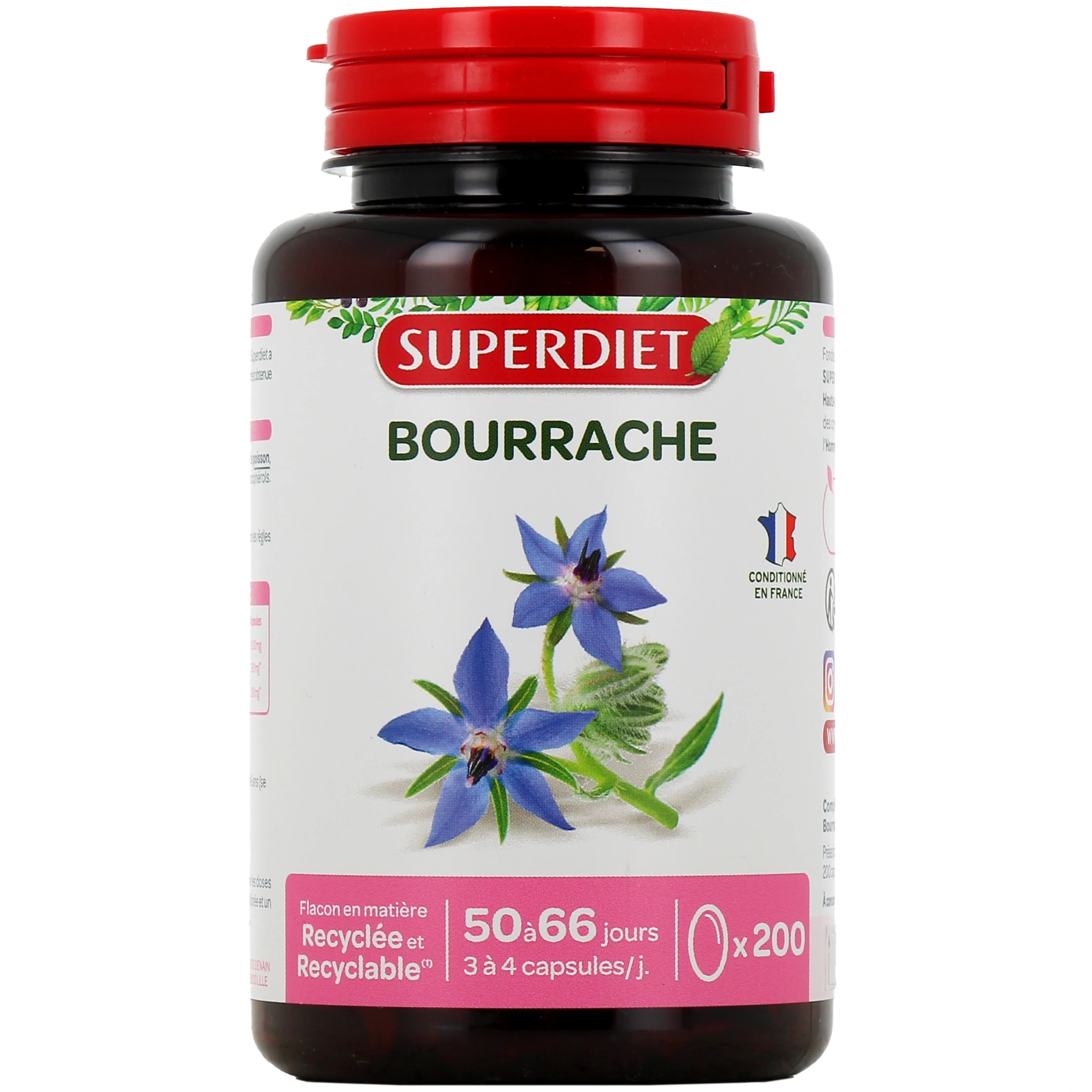 Présentation proposée pour les capsules Super Diet Bourrache sur notre pharmacie en ligne : Boîte de 200 capsules.
