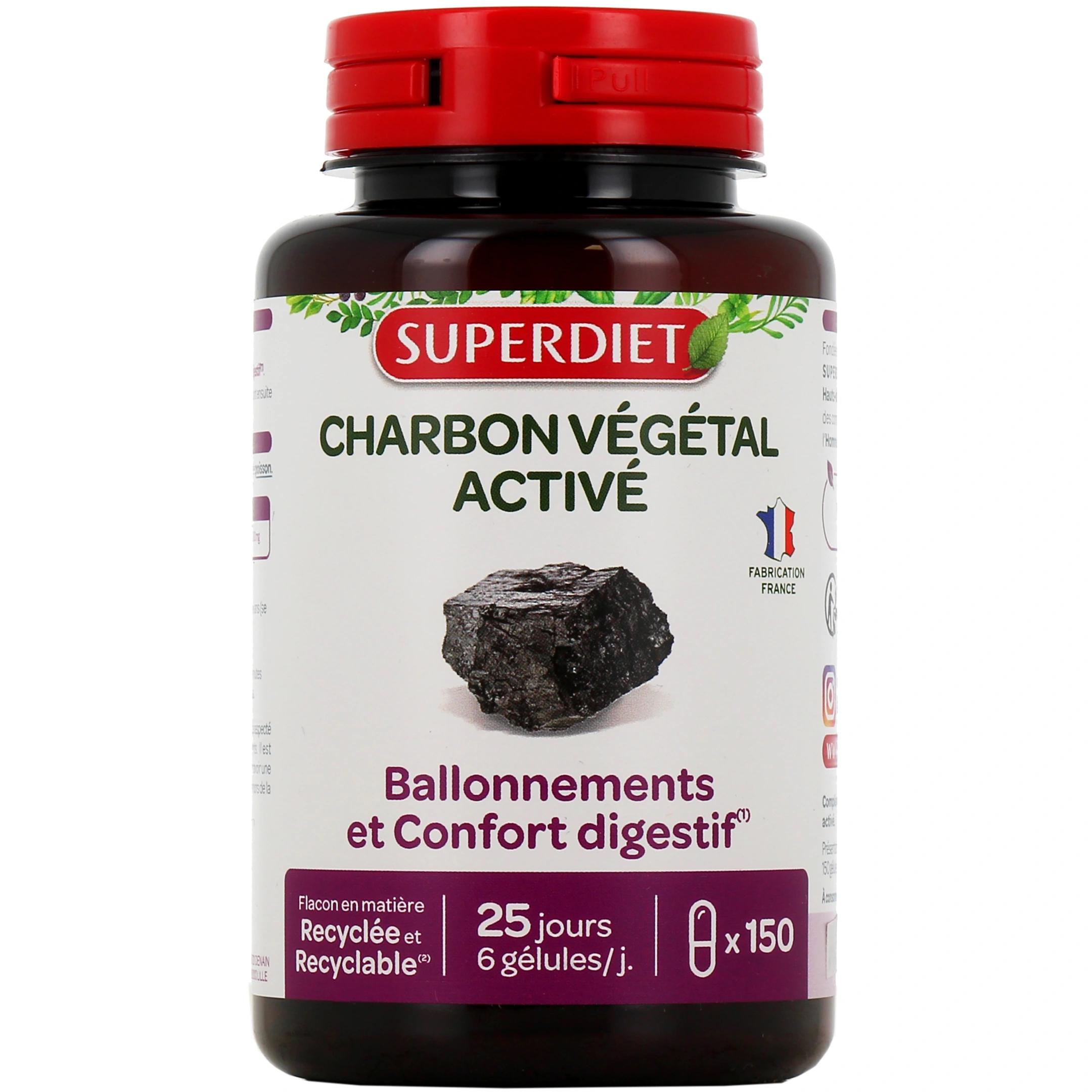 Le complément alimentaire Charbon Végétal Activé de Super Diet contribue au confort digestif.