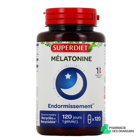 Vous pourrez sélectionner le complément alimentaire Super Diet Mélatonine parmi les présentations suivantes chez Pharmacie des Drakkars : boîte de 120 gélules.