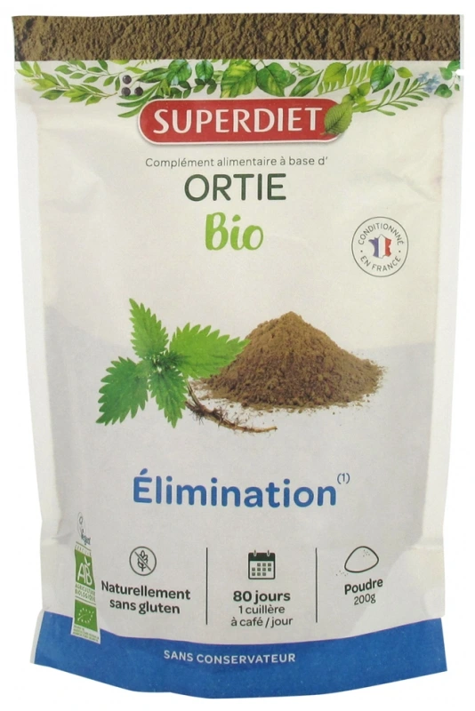 Super Diet Ortie Bio est un complément alimentaire sous forme de poudre. A base d'ortie, il soutient les fonctions d'élimination de l'organisme.