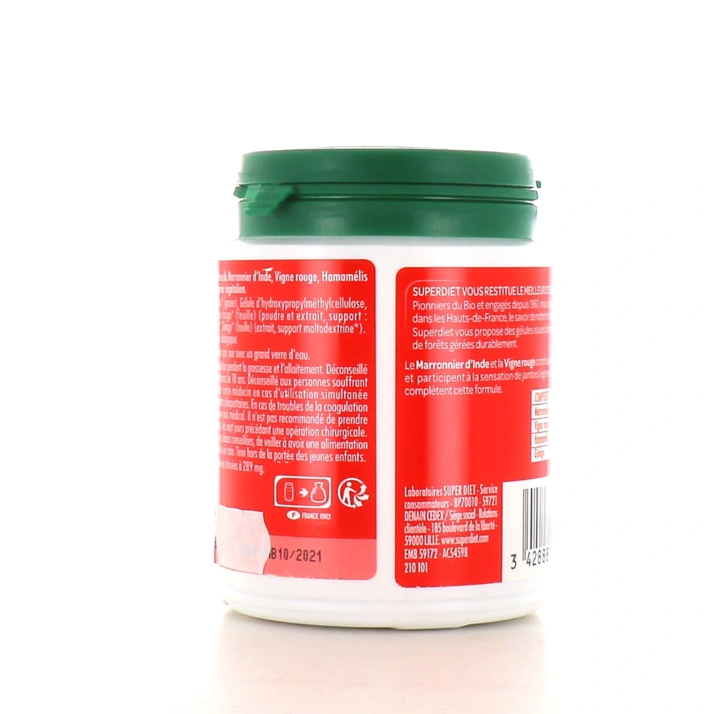 Formulé avec du marronnier d'inde, de l'hamamélis, de la vigne rouge et du ginkgo, Superdiet Circulation Bio est un complément alimentaire qui participe à la tonification de la circulation.