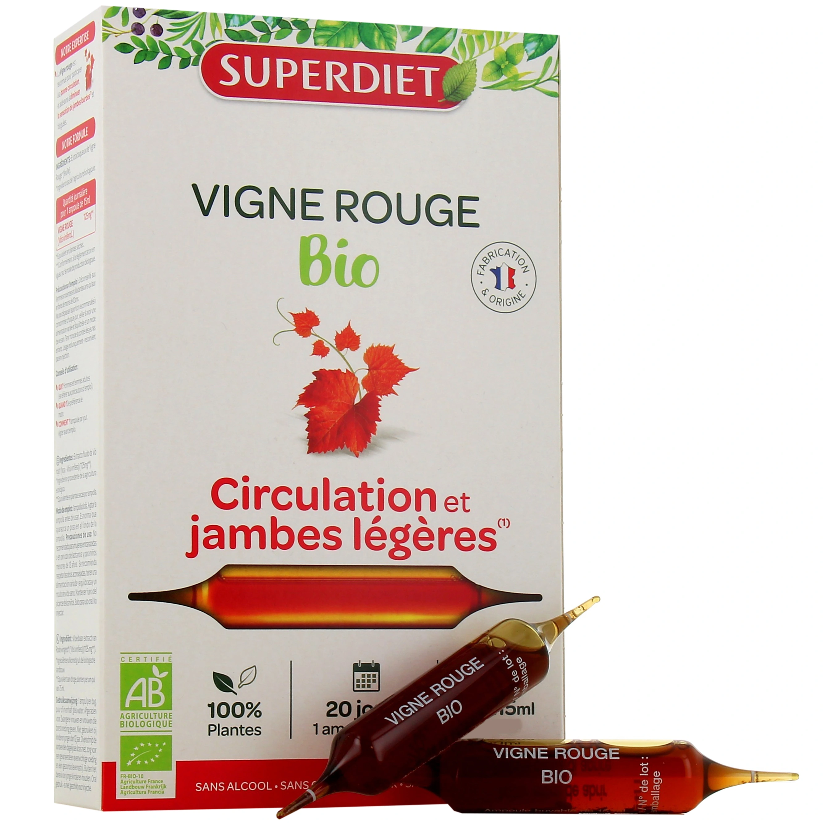 Le complément alimentaire à la vigne rouge SuperDiet a été développé pour aider à une bonne circulation sanguine. En effet, la vigne rouge est un actif d'origine végétale connue pour contribuer au bien-être circulatoire mais également pour réduire la sensation de jambes lourdes et fatiguées.