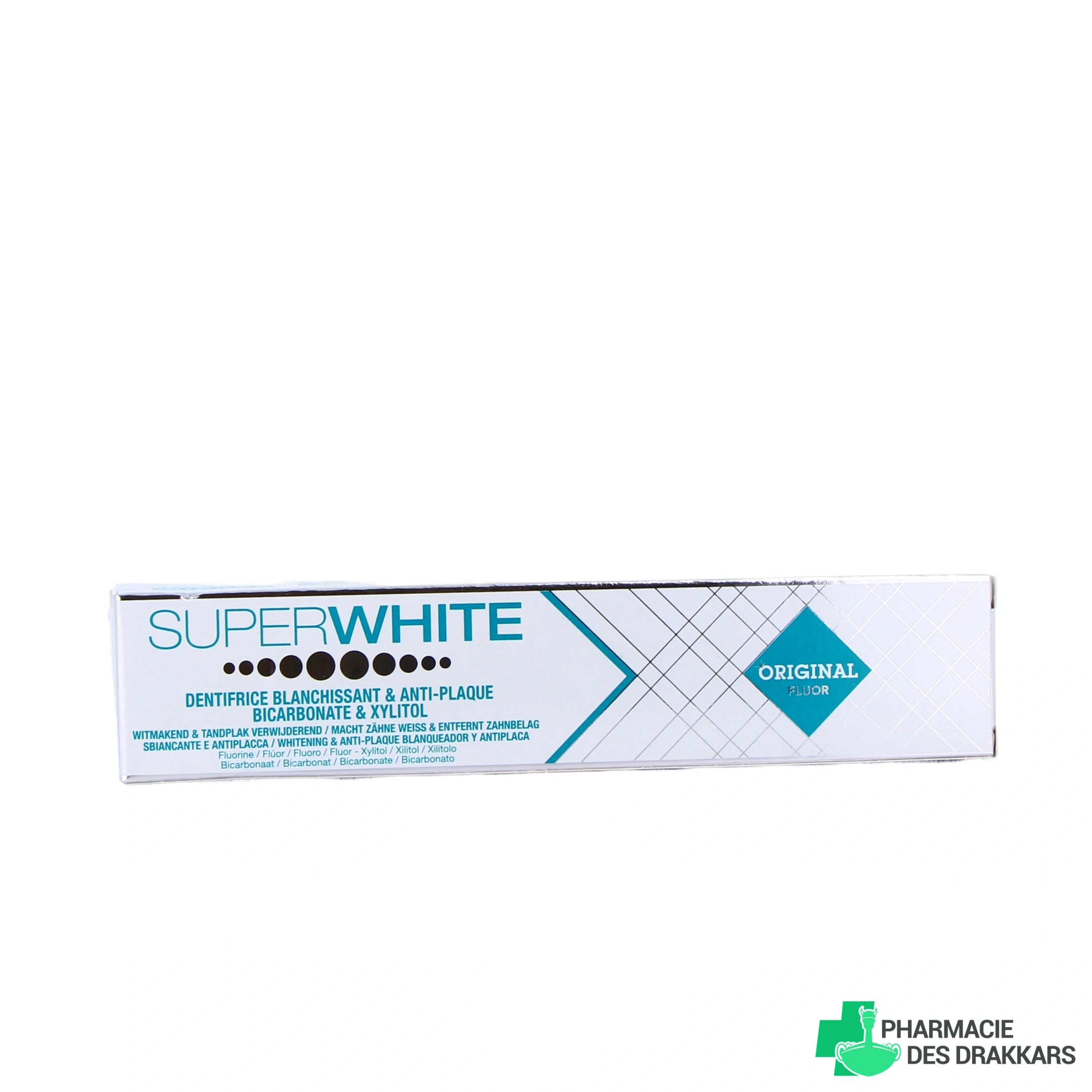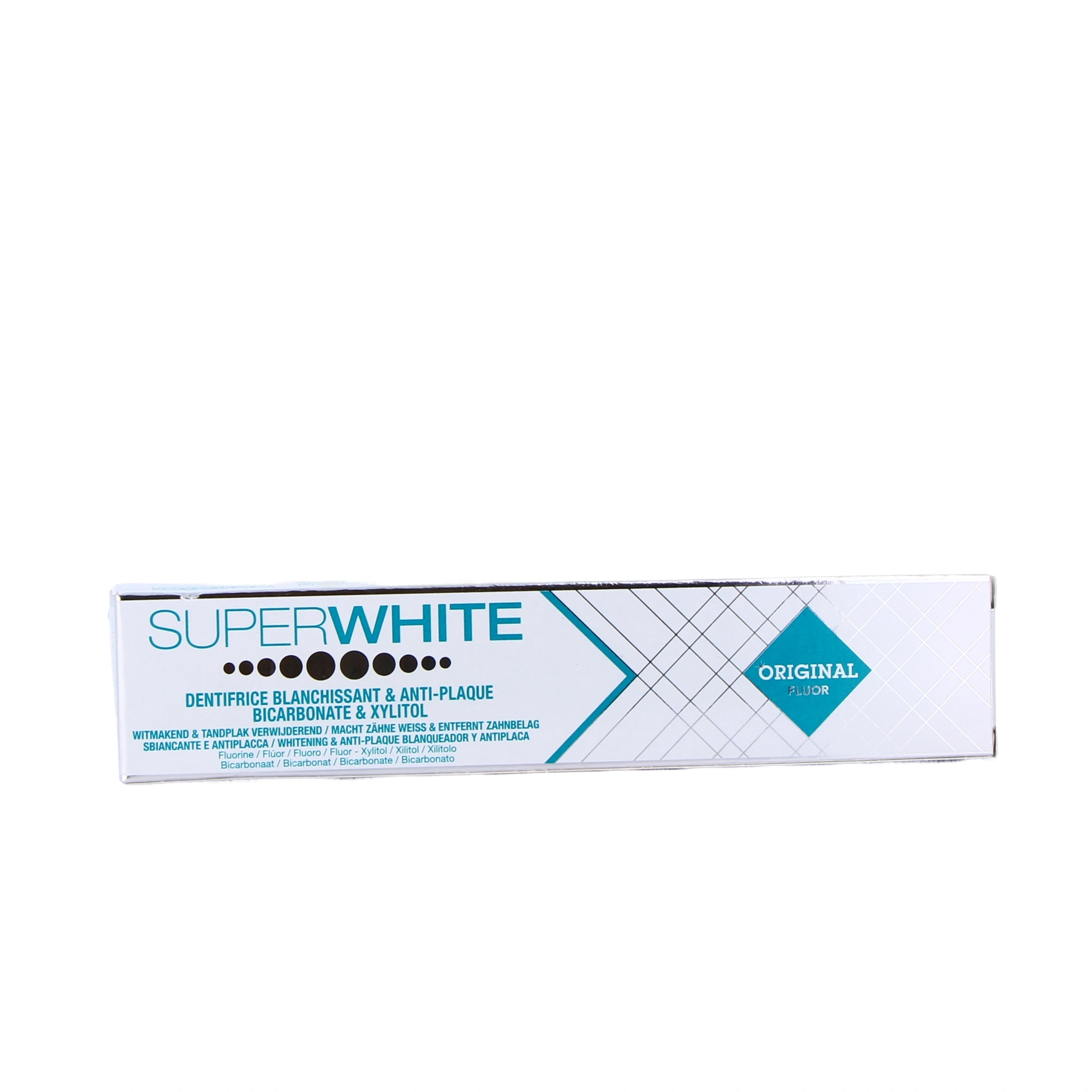 Le dentifrice blanchissant anti-plaque Superwhite Original est un dentifrice au fluor destiné à protéger contre la plaque dentaire, à favoriser la blancheur des dents tout en procurant une véritable sensation de fraîcheur.