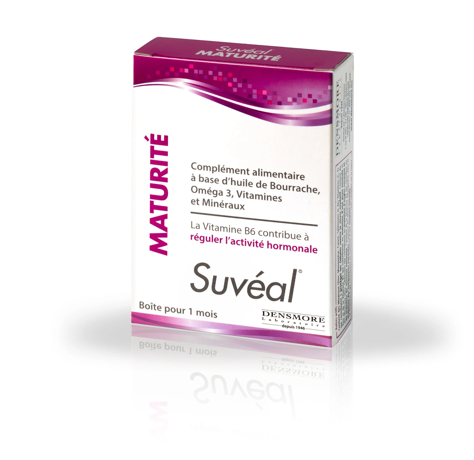 Densmore Suveal Maturité est un complément alimentaire à base d'huile de Bourrache, Oméga 3, Vitamines et Minéraux. La Vitamine B6 contribue à réguler l’activité hormonale.