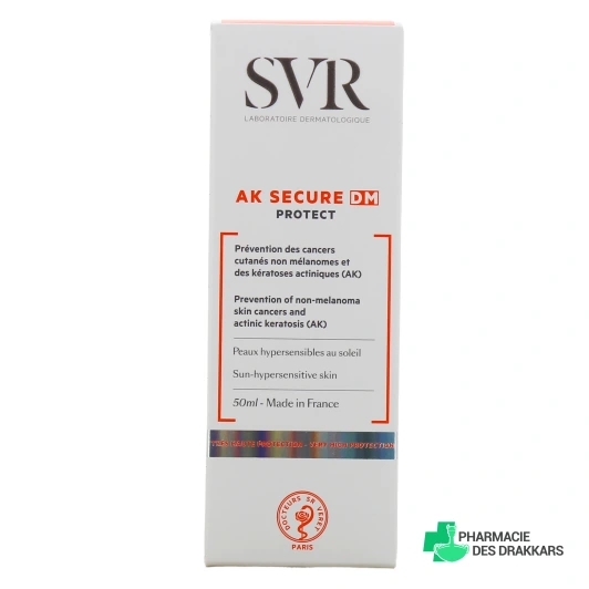 AK Secure DM Protect est un dispositif médical de la marque SVR. Il s'agit d'une protection solaire pour peau hypersensible au soleil, à risque de cancer cutané non mélanome ou de kératose actinique.