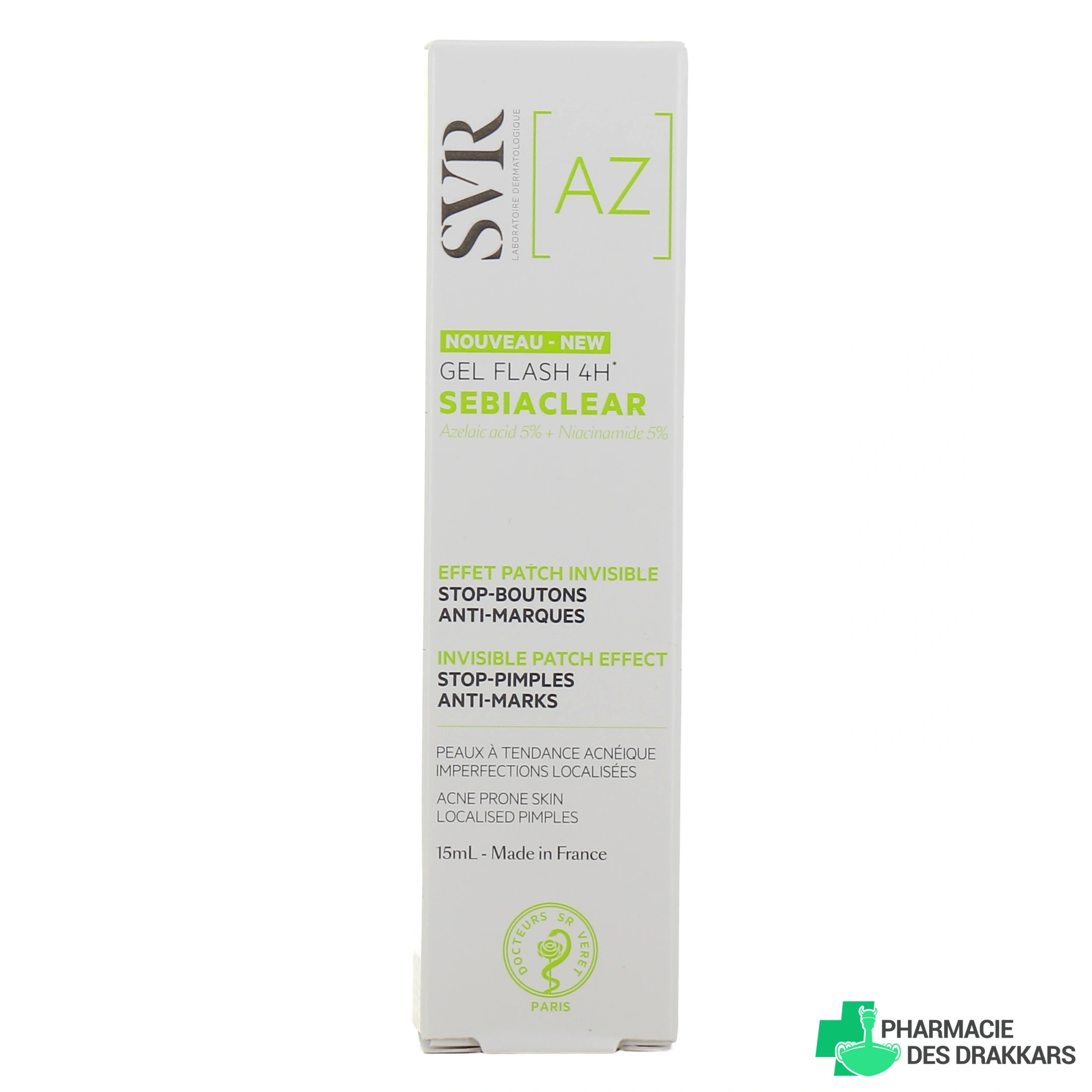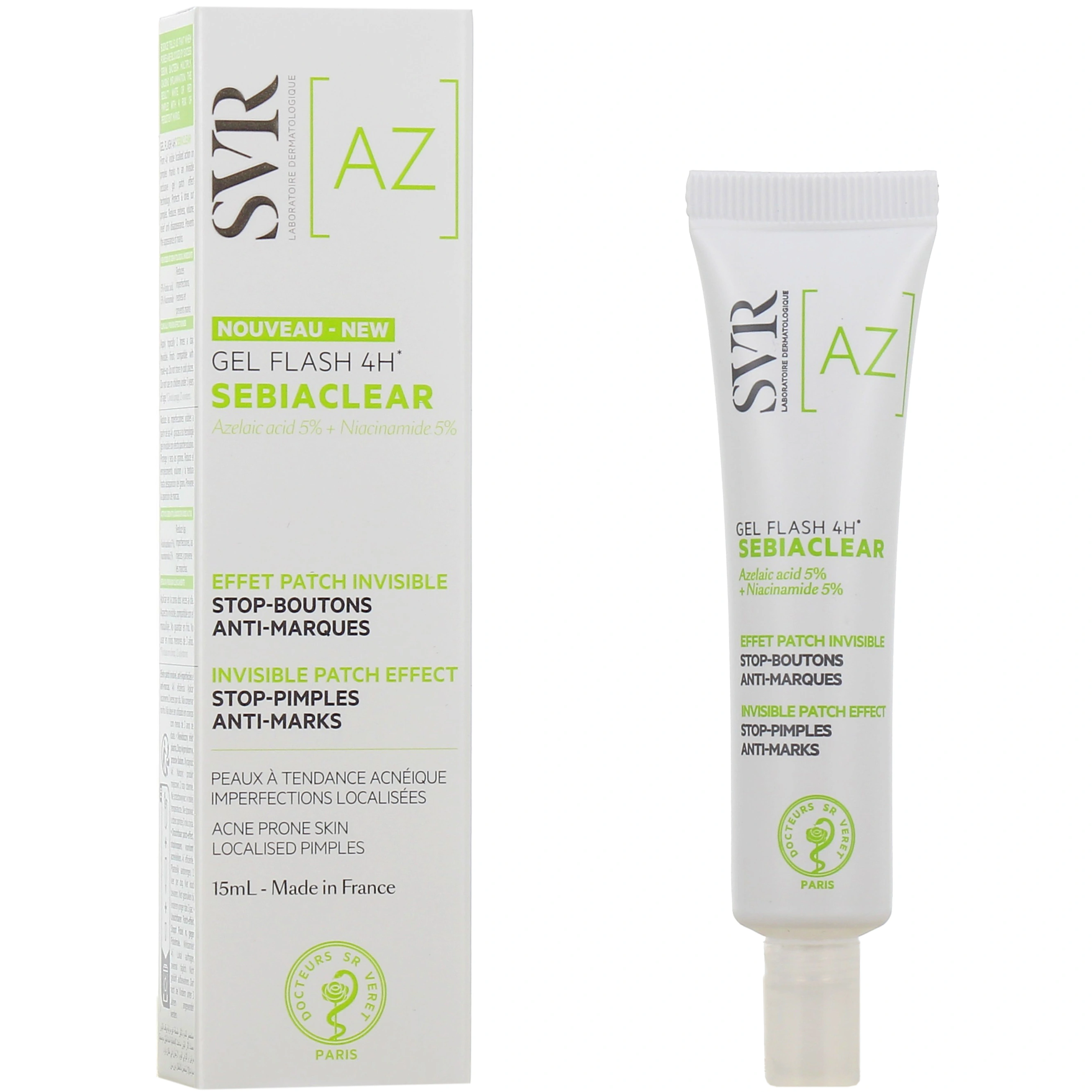 Destiné aux peaux à tendance acnéique présentant des imperfections localisées sur le visage, le gel flash SVR exerce une double action stop boutons et anti-marques. Doté d'une technologie gel effet patch invisible occlusif, il s'applique facilement sur les boutons rouges et blancs pour une action visible dès 4h. L'efficacité de ce soin SVR Sebiaclear est prouvée cliniquement, il élimine les imperfections même sur les peaux les plus sensibles sans faire de compromis sur la tolérance cutanée. Le gel flash 4h SVR réduit la rougeur, le volume et le relief de l’imperfection jusqu’à sa disparition tout en limitant les marques.