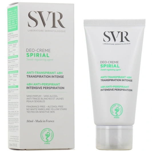 Adapté aux peaux sensibles, le déo-crème Spirial de SVR est un anti-transpirant indiqué en cas de transpiration intense. Il s'utilise sur les aisselles, mais aussi sur les mains, les pieds, les plis ou encore le visage.