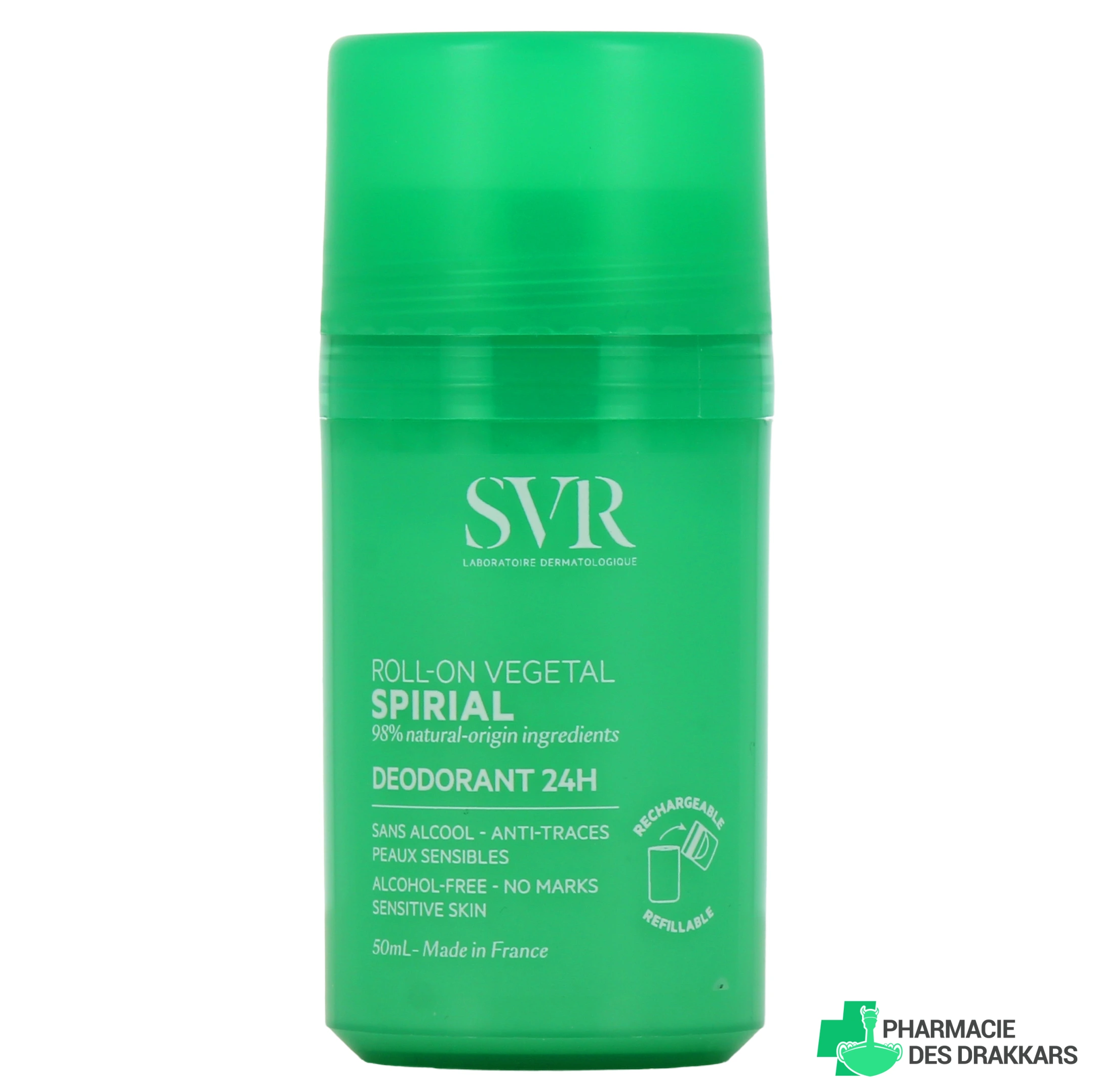 Présentations proposées pour le déodorant roll-on 24h SVR Spirial Végétal sur notre pharmacie en ligne : Roll-on rechargeable de 50 ml, à l'unité ou en lot avec 1 recharge de 50 ml, recharge de 50 ml ou Lot de 2 roll-on 50 ml.