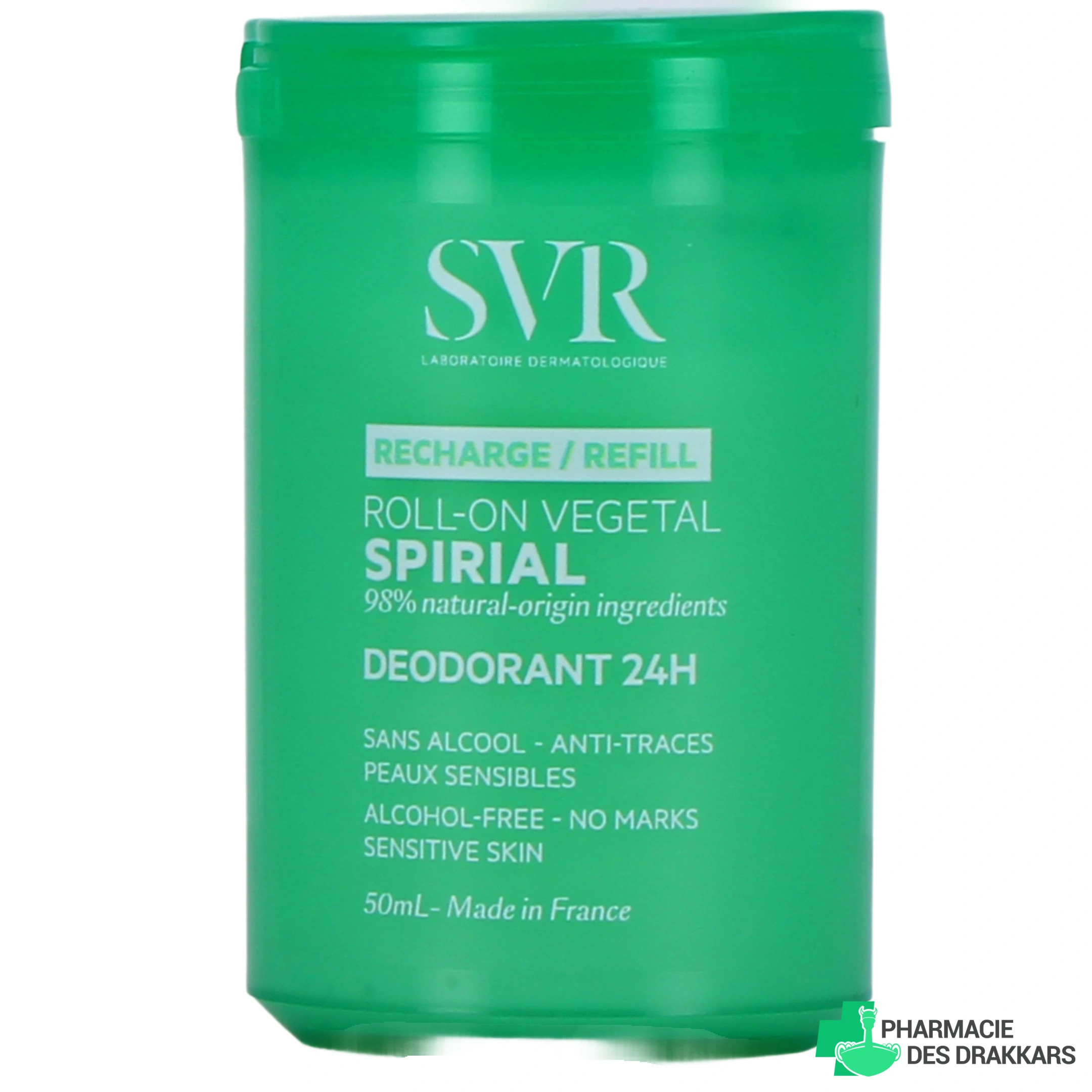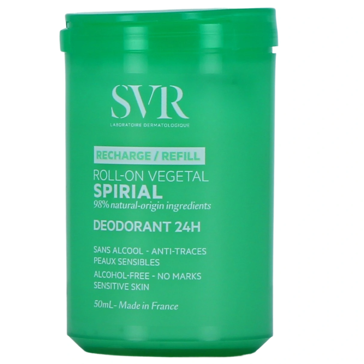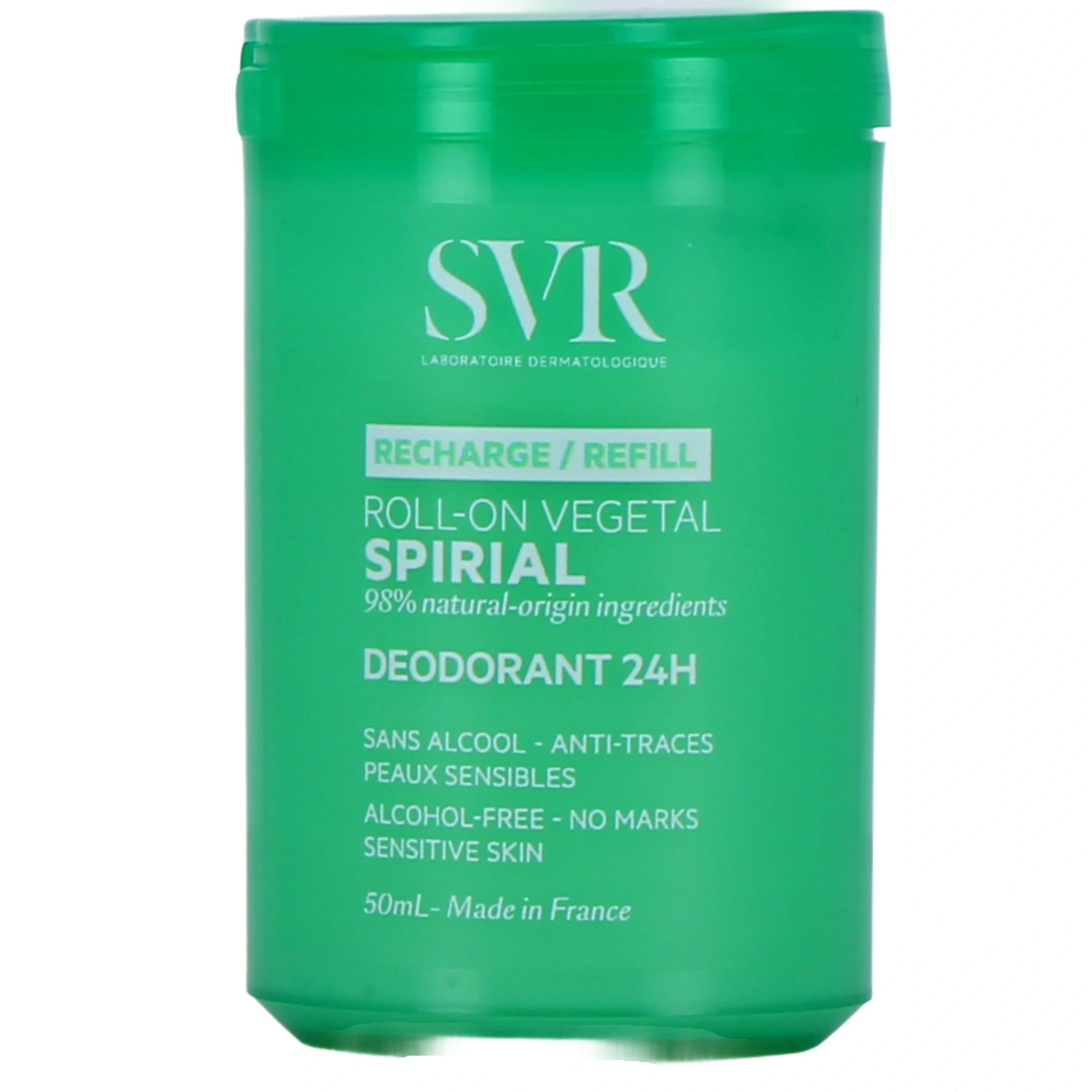Présentations proposées pour le déodorant roll-on 24h SVR Spirial Végétal sur notre pharmacie en ligne : Roll-on rechargeable de 50 ml, à l'unité ou en lot avec 1 recharge de 50 ml, recharge de 50 ml ou Lot de 2 roll-on 50 ml.