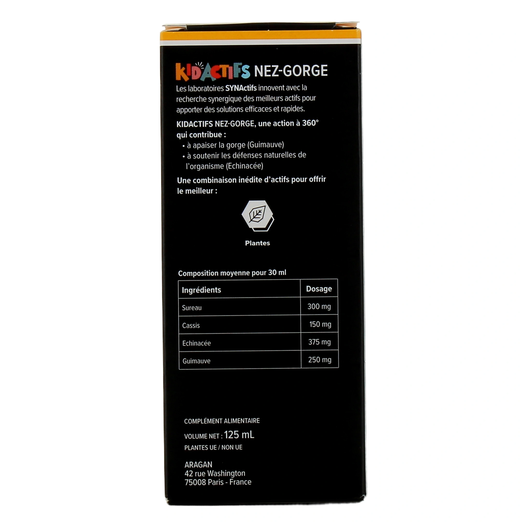 Présentation proposée pour Synactifs Kid Actifs Nez Gorge sur notre pharmacie en ligne : Flacon de 125 ml avec gobelet doseur