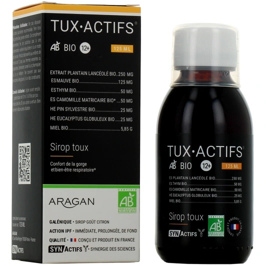 Tux Actifs 12+ est un sirop bio renfermant une combinaison inédite d'actifs BIO pour offrir le meilleur : extraits secs de plantes, huiles essentielles et produit de la ruche. Il apporte une action à 360° qui contribue au confort de la gorge et au bien-être respiratoire, grâce à la camomille. Le sirop pour la toux Tux Actifs Bio s'appuie sur une combinaison d'actifs et une galénique permettant d'apporter une action de fond grâce aux huiles essentielles d'eucalyptus globuleux et de pin. Des extraits de plantain, de mauve, ainsi que du miel de fleurs bio complètent la formule de ce sirop.