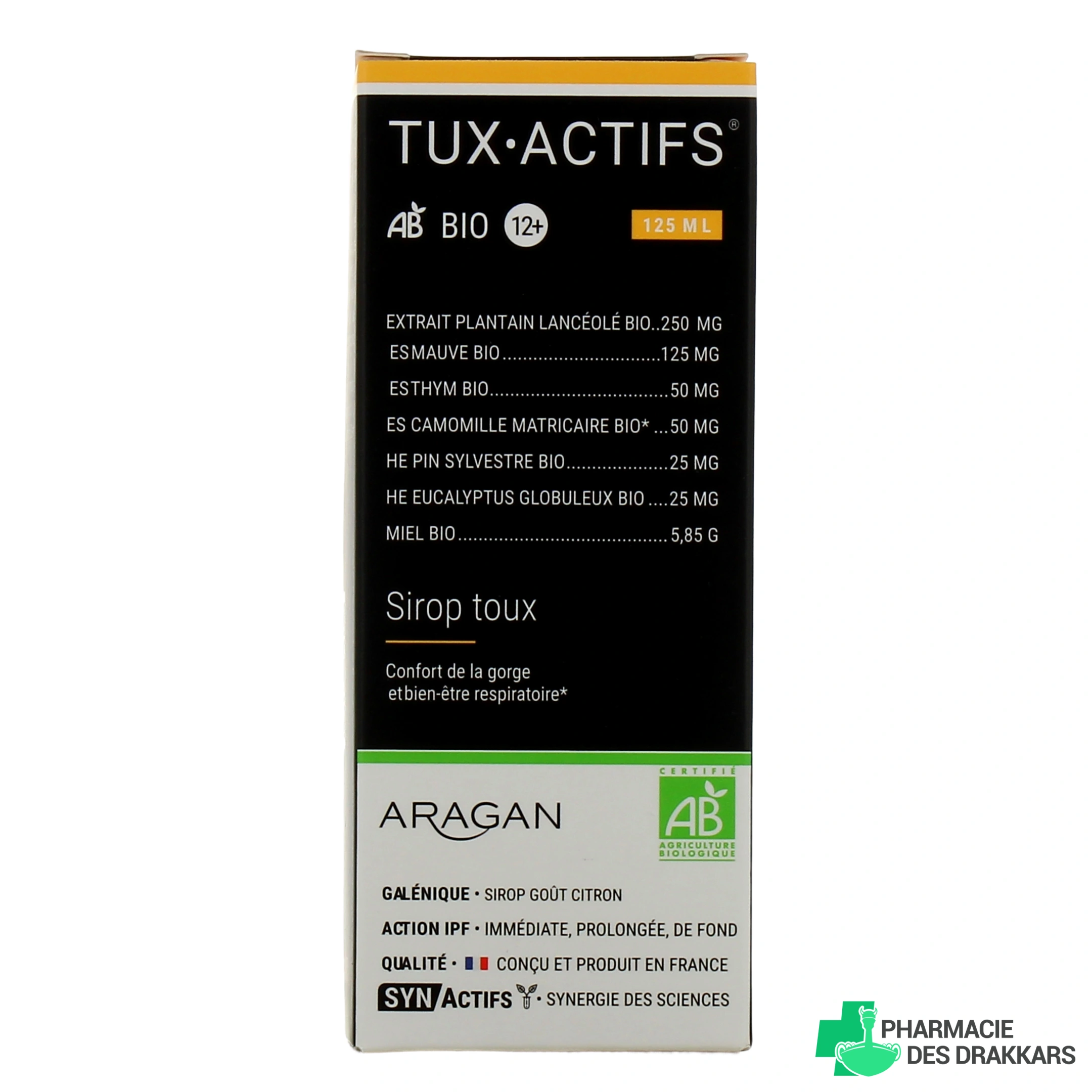 - Le sirop Tux Actifs est déconseillé aux enfants de moins de 12 ans, aux femmes enceintes ou allaitantes.