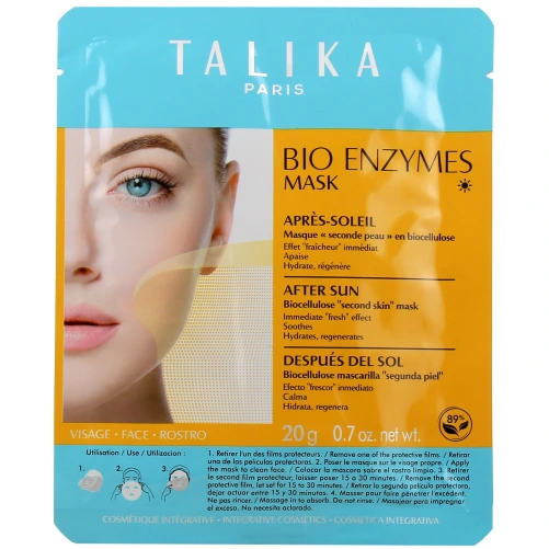 Le masque Après-Soleil Bio Enzymes de la marque Talika est un masque à usage unique pour le visage qui apaise, hydrate et régénère les peaux exposées au soleil avec un effet rafraîchissant.