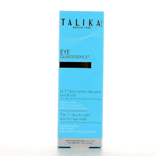 Conditionnement proposé par la Pharmacie des Drakkars pour Talika Eye Quintessence Anti-Âge : flacon de 2 x 10 ml.