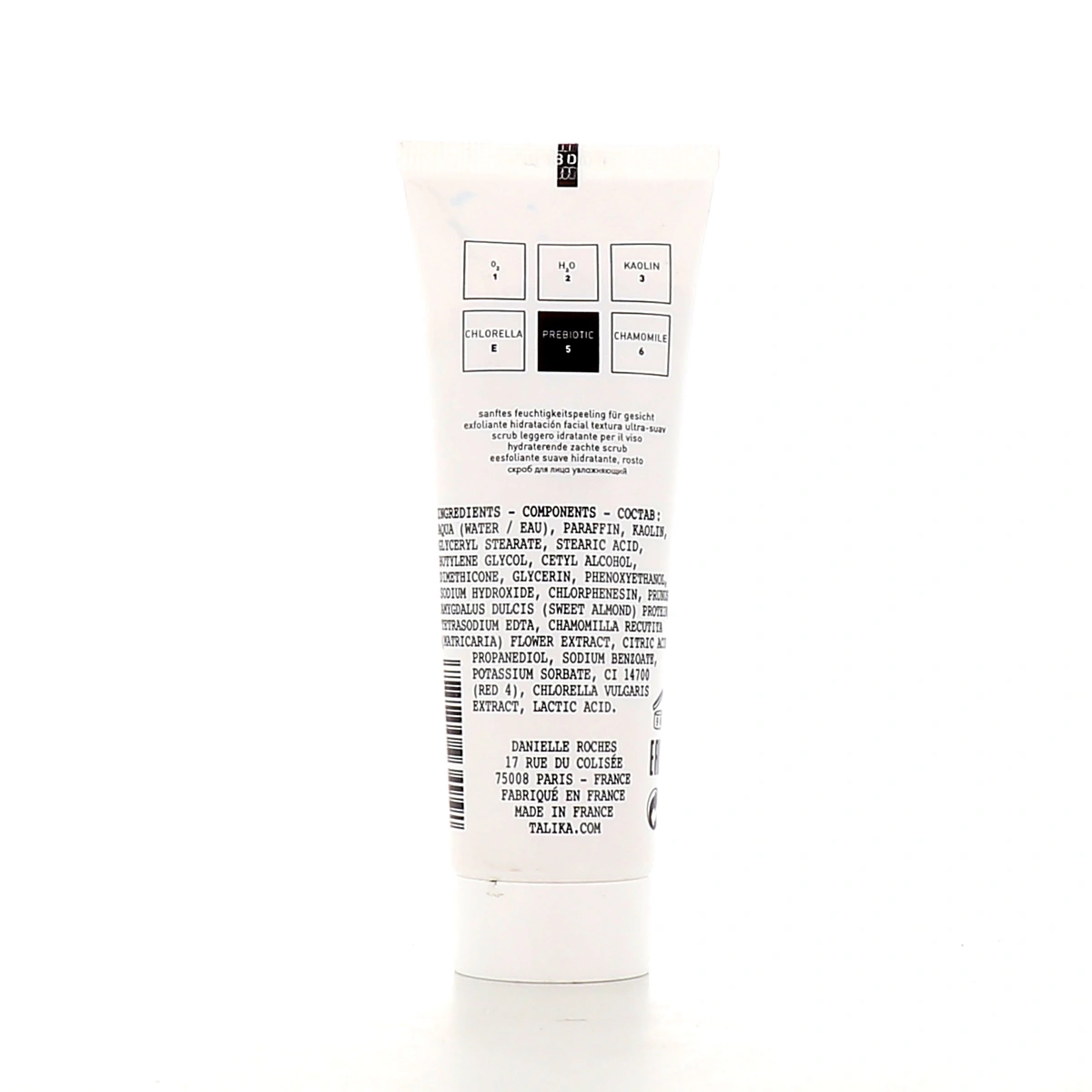 Le gommage doux Skintelligence Hydra de Talika offre une texture crème qui se transforme en poudre d'argile afin de fusionner avec les cellules mortes pour mieux les éliminer. Le Kaolin que contient ce gommage permet de reminéraliser et d'absorber l'excès de sébum ainsi que les particules polluantes. La fleur de Camomille apaise la peau et les protéines d'amande douce apportent de l'hydratation. Les prébiotiques de microalgue verte, quant à eux, stimulent les facteurs de croissance de la peau et participent au renouvellement cellulaire.