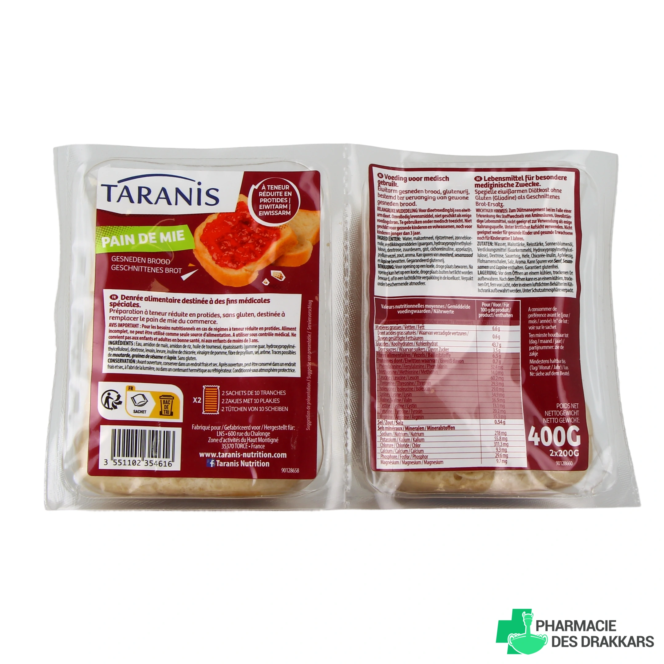 Vous pourrez retrouver le pain de mie Taranis dans les présentations suivantes sur notre pharmacie en ligne : étui de 400 g - 2 pains tranchés de 200 g (soit 2 sachets de 10 tranches).