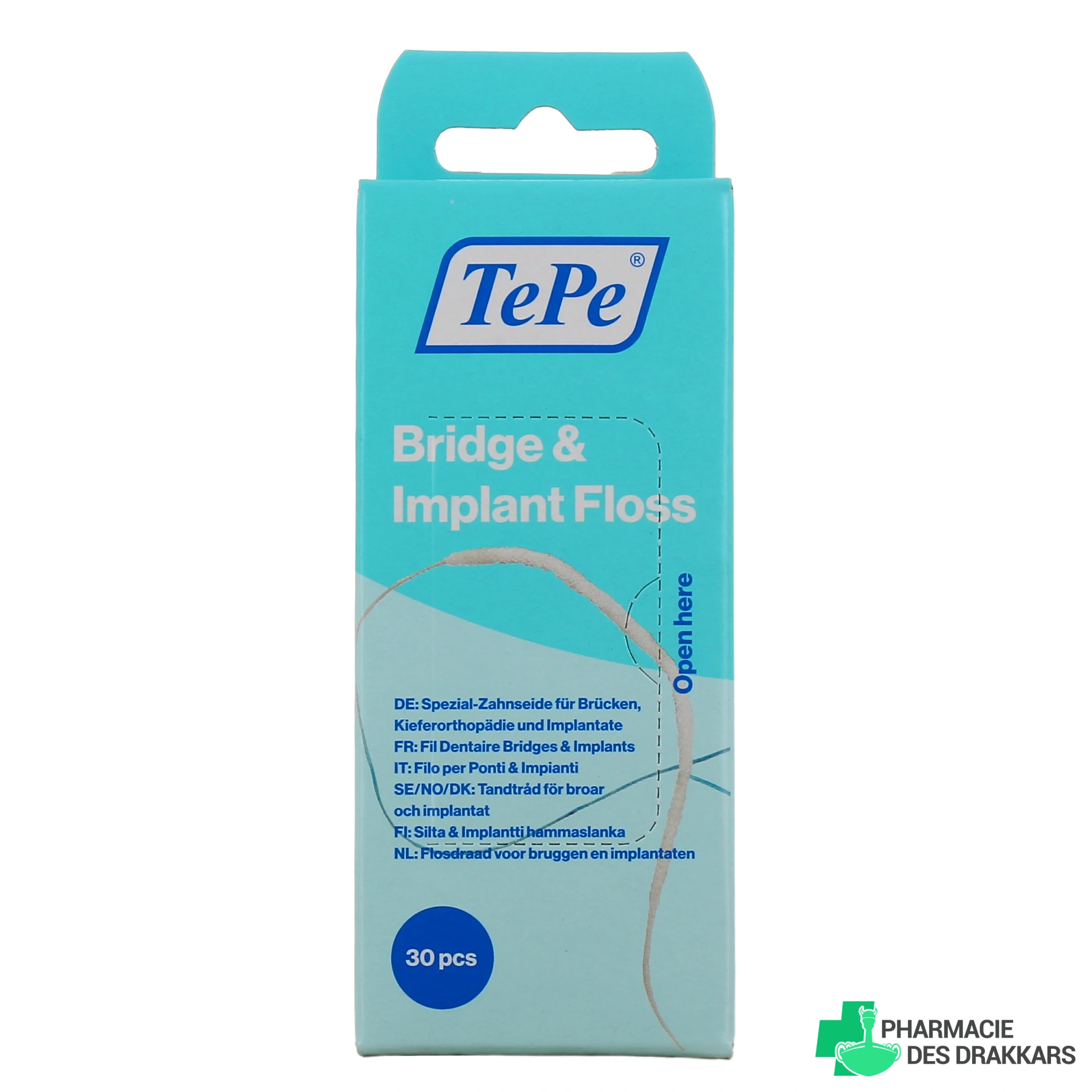 Présentation proposée pour TePe Fil Dentaire Bridge & Implant sur la pharmacie en ligne des Drakkars : boîte de 30 fils dentaires.