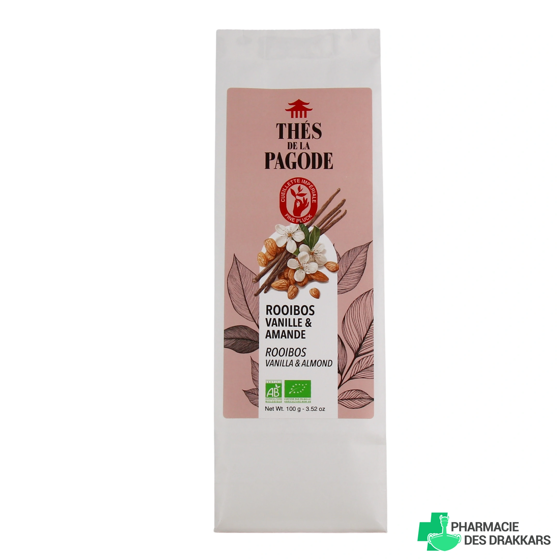 Vous pourrez retrouver l'infusion Rooibos Gourmand Vanille Amande Bio des Thés de la Pagode dans les présentations suivantes chez Pharmacie des Drakkars : sachet de 100 g de thé en vrac, ou boîte de 100 g (Edition Prestige).