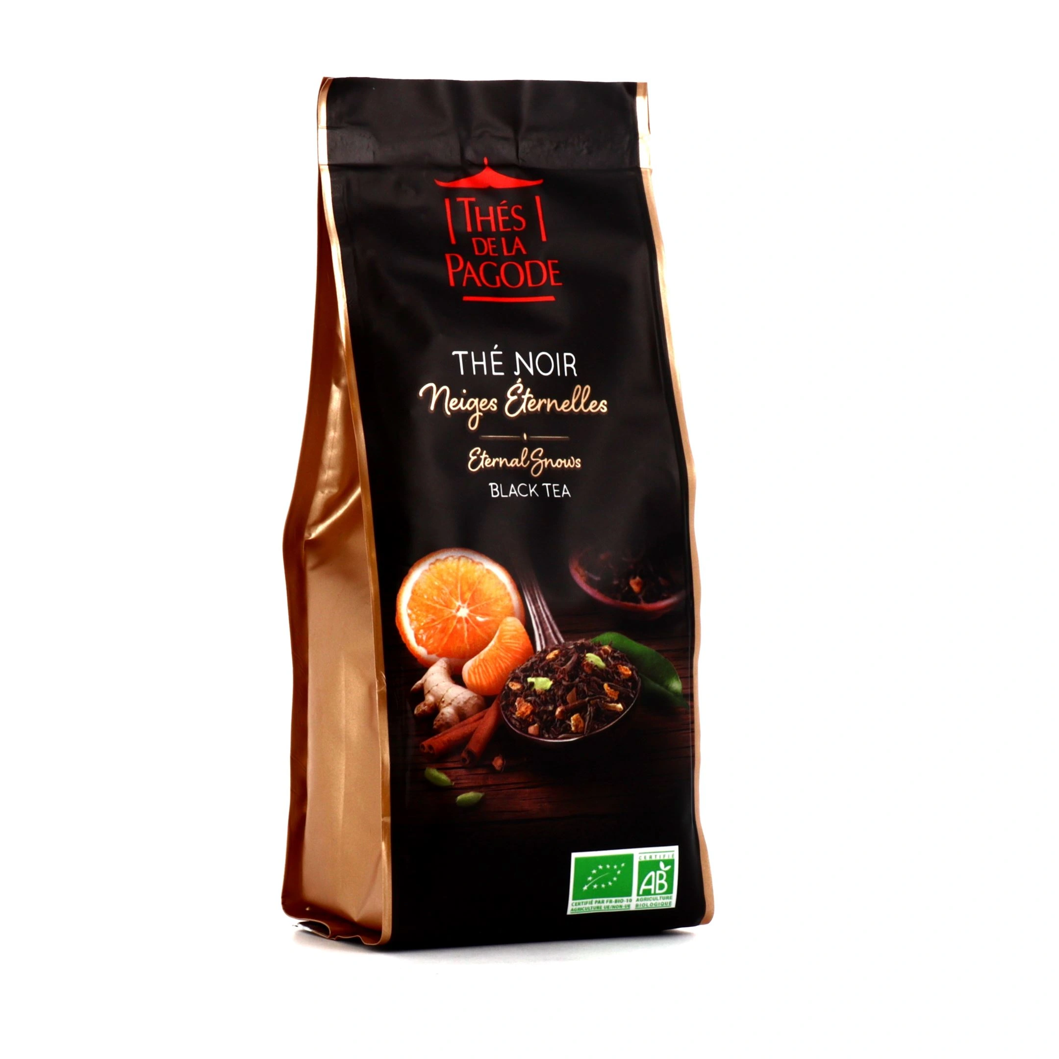 Plongez dans un univers aux délicieuses notes d'agrumes et d'épices chaudes qui vous rappelleront la magie de noël grâce au thé noir Neiges éternelles Bio mis au point par les Thés de la Pagode !
